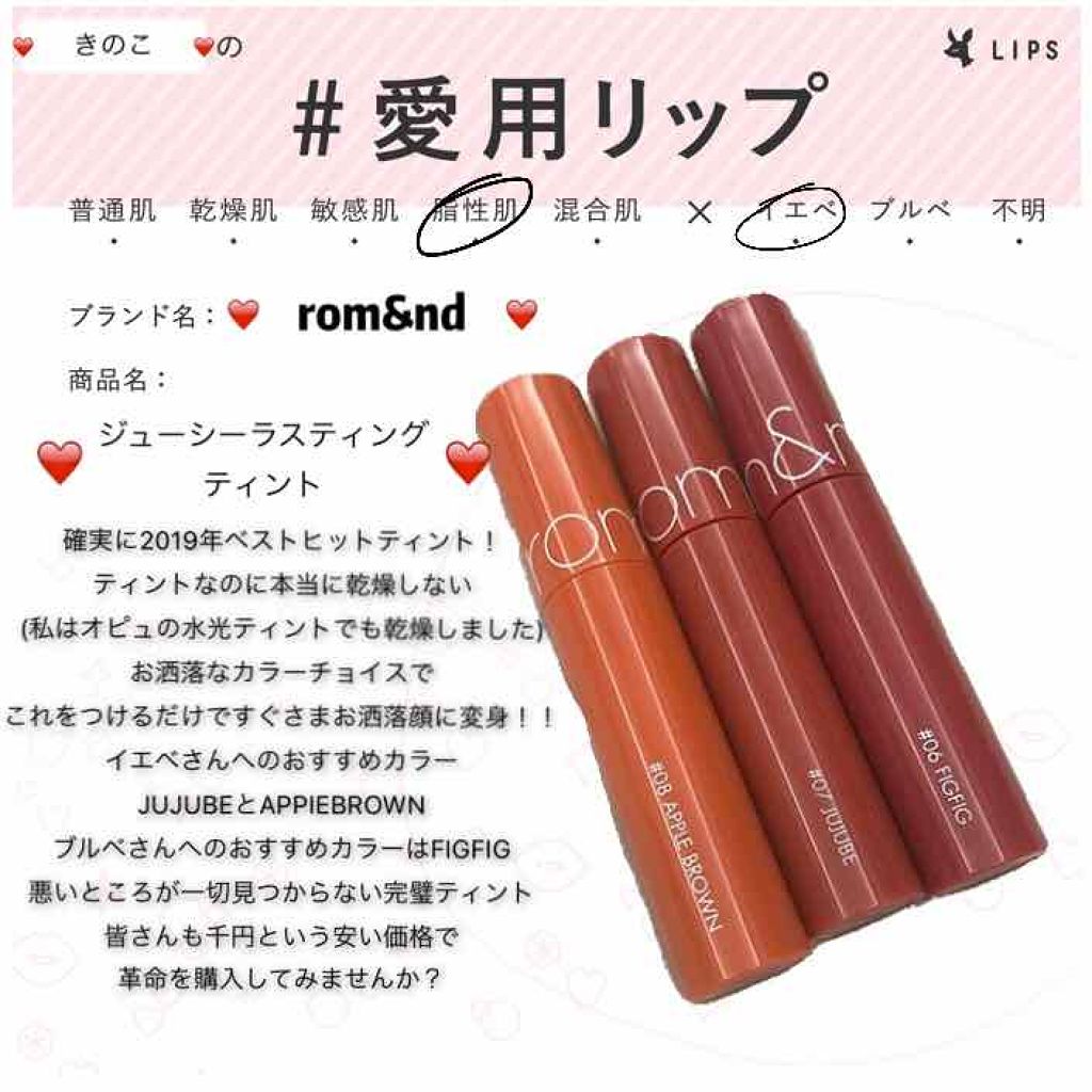 💖rom&nd♡ザ ジューシーラスティングティント・新作の#20JUJUFIG♪・〜果物からみつけた多彩なカラーチャート〜・パケが可愛いティント💖発色も良く、持ちいいティントです🎵・するすると唇に塗りやすくてぷるぷるで光沢感が!ティッシュオフ...