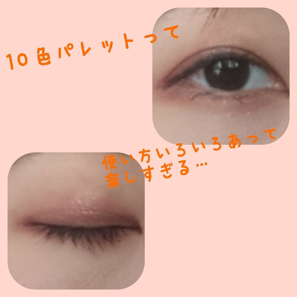 - 肌なじみの良い、鮮やかな発色で目元を華やかに彩る捨て色なしの10色アイシャドウパレット 異なる3種のテクスチャーを自由に組み合わせて、グラデーションも思いのままに。 NEW 2023.4 ・肌トーンにあう配色を詰め込んだトレンドカラー 肌トーンに合わせて、自分に似合うトレンドカラーが楽しめる♡ パーソナルカラー×トレンドカラーの掛け合わせパレットで、デイリーメイクもスペシャルメイクも気分にあわせてなりたい自分に! ・むにゅっとジェル質感ラメで高密着、煌めく目元 パレットの中でもポイントとなる大きめ粒子のラメは、ジェルのような新質感で落ちにくく肌にぴったりと密着します。キラキラとした目元をキープします。 ・使うカラーは大きめに!リアル捨て色なしパレット ベースやラメのよく使うカラーと締め色や濃い色等の減りが少ないカラーを異なるサイズで詰め込んだ、リアル捨て色なしパレット! <使用方法> 付属のデュアルシャドウブラシでベースカラーをまぶた全体に塗り広げます。細いブラシでグラデーションや目尻、アイライン、涙袋などのポイントカラーをのせて仕上げます。