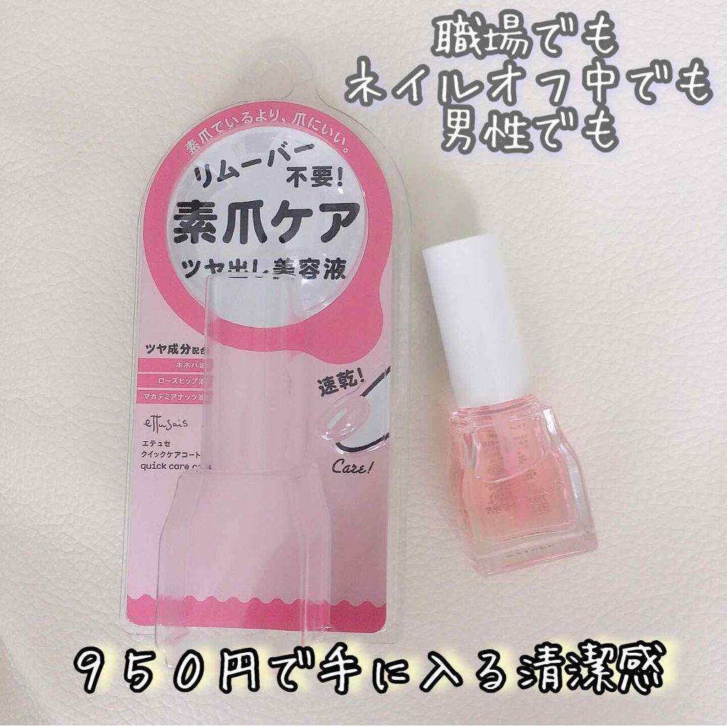 - 素爪でいるより、爪にいい。速乾!リムーバーいらず!透明薄膜ヴェールで爪を保護&ケアする、ツヤ出しネール用美容液。 弱い爪を摩擦や乾燥から保護し、爪のカケ・割れ・二枚爪・乾燥を防ぎます。 塗布すると、エッセンスコート成分が均一な薄膜をつくり、ナチュラル光沢成分&植物オイル(*)が自然なツヤを与えます。 ほんのりピンク色で、爪磨きしたようなナチュラルなツヤ仕上げです。 トルエンフリー、無香料で爪へのやさしさを配慮。 通常のトップコートやハードナーは、一部はがれると、厚みがあるため、凹凸になりますが、「クイックケアコート」は、厚みのない薄膜仕上げなので、落とさず、上から塗布してもキレイになじむので、リムーバーいらずです。 *ホホバ油・ローズヒップ油・マカデミアナッツ油 <こんな時におすすめ> ・爪を保護しながらツヤも出るので、マニキュアをお休みしたい時に ・超速乾だからササッと簡単にケアしたい時に ・ナチュラルなツヤ、仕事上ネールNGでもキレイに見せたい時に 【価格改定について】 いつもご愛用いただきありがとうございます。 この度、原材料高騰などにより、2025年9月1日より、希望小売価格の変更を行うこととなりました。 何卒ご理解を賜わりますよう、心よりお願い申し上げます。 エテュセ クイックケアコート 旧価格 税込1,045円(税抜950円) ↓ 新価格 税込1,265円(税抜1,150円)