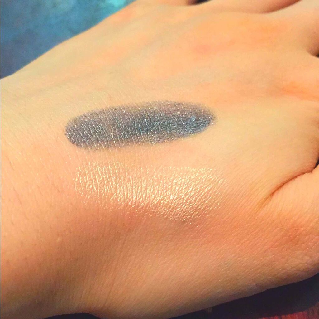 ブルーメイク。色々手を抜いてます。アイホールと下まぶたにキャンメイクのシークレットアイシャドウ(右)をのせてます。手に塗ってみるとラメがかなりあるなーと思いますが、チップで顔に載せてみると意外と控えめでした。(オレンジライトの下で撮ったので、...