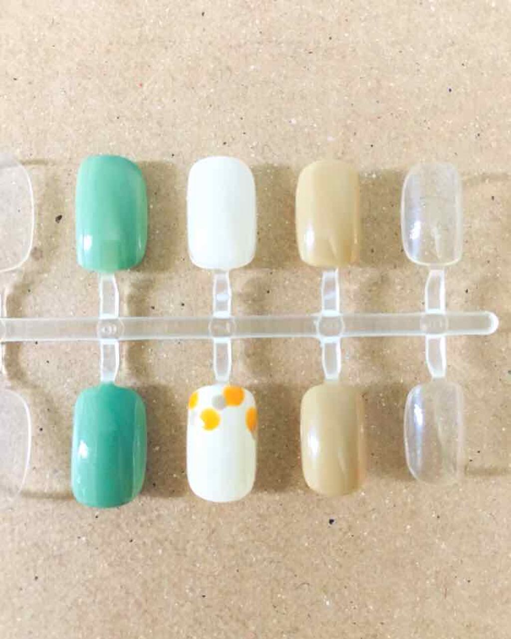 EMODAのネイルは雑誌の付録です。 パインじゃなくてメロンパンっぽくない?って思いつつコレは、🍍なんだと暗示をかけてやるのがコツです😂 人差し指、薬指 EMODAのキャロットオレンジを多めに一度塗りをし乾いたところへACエナメル ラテライトを細筆で斜めに線を引いてきます。 中指、小指 EMODA のゴールドオリーブを多めに一度塗り。seriaのネイルシールを貼り、トップコートを塗り完成です。