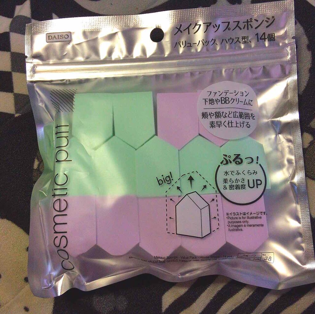 DAISOメイクアップスポンジバリューパックハウス型14個ダイヤモンド型15個それぞれ¥110ベースメイクは指で塗ることが多かったんだけど、これを使うと圧倒的に早く綺麗に仕上がるからついつい買っちゃう✨ちなみに私は水を含ませてプルプルにして使...
