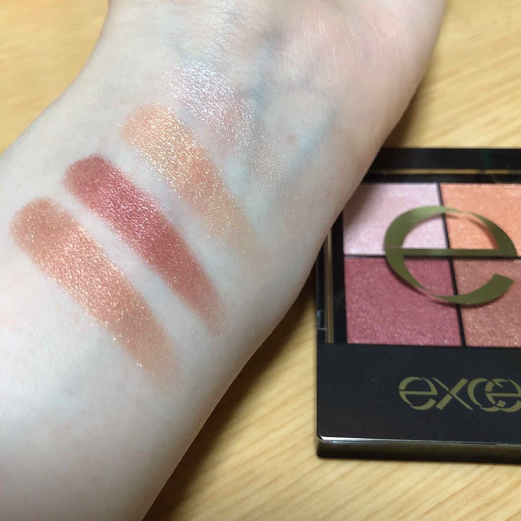 - 1.重ねてもくすまないクリアな発色。ナチュラルに溶け合う絶妙4カラー。 ツヤタイプ(左上・左下カラー):アイホール全体にぼかしたり、目尻へのポイント使いも。 ラメタイプ(右上カラー):アイホール中心や下まぶたにきらめきのアクセント。 マットタイプ(右下カラー):単色で陰影を付けたり、ツヤタイプと重ねてニュアンスをプラス。 2.うっとりするほどリッチな質感で粉飛びしないのに、軽いタッチで伸びて重ねやすいテクスチャー。 3.スクワラン(保湿)配合で目元の乾燥を防ぎます。 [PERFORMANCE] 色と質感の重ね着を楽しむ、ファッション感覚アイシャドウパレット [DESIGN] ・まぶたにひっかからない、なめらかな上質チップ ・薄型コンパクトだからポーチの中でかさばらない [QUALITY] 1.重ねてもくすまないクリアな発色 ナチュラルに溶け合う絶妙4カラー 2.パールの重ね技でまぶたに極上のツヤ感 微細多色 カラーパール 銀コーティング ガラスパール* excel GOLD-MIX処方(金パール配合)* (*右上のシャイニーカラーのみ) 3.うっとりするほどリッチな質感で粉飛び知らず!なのに、軽いタッチで伸びて重ねやすい 4.スクワラン(保湿)配合で目元の乾燥を防ぐ