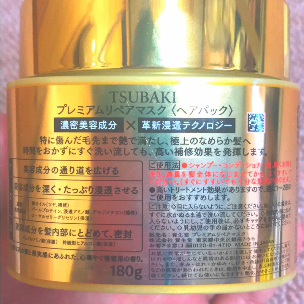 - <つめかえ用> 水、グリセリン、ジメチコン、イソペンチルジオール、水添ナタネ油アルコール、ベヘントリモニウムクロリド、ステアリルアルコール、ソルビトール、アミノプロピルジメチコン、ヒドロキシエチルウレア、アルキル(C12,14)オキシヒドロキシプロピルアルギニンHCl、ステアルトリモニウムクロリド、乳酸、ツバキ種子油、ラウロイルグルタミン酸ジ(フィトステリル/オクチルドデシル)、ジラウロイルグルタミン酸リシンNa、ローヤルゼリーエキス、アセチルヒアルロン酸Na、加水分解コンキオリン、イソプロパノール、セタノール、オクチルドデカノール、エタノール、クエン酸、乳酸アンモニウム、BG、DPG、AMP、アモジメチコン、PPG-2-デセス-12、トコフェロール、フェノキシエタノール、安息香酸Na、香料、赤227、黄4 <プレミアムリペアマスク> 水、グリセリン、ジメチコン、イソペンチルジオール、水添ナタネ油アルコール、ベヘントリモニウムクロリド、ステアリルアルコール、ソルビトール、アミノプロピルジメチコン、ヒドロキシエチルウレア、アルキル(C12,14)オキシヒドロキシプロピルアルギニンHCl、ステアルトリモニウムクロリド、乳酸、ツバキ種子油、ラウロイルグルタミン酸ジ(フィトステリル/オクチルドデシル)、ジラウロイルグルタミン酸リシンNa、ローヤルゼリーエキス、アセチルヒアルロン酸Na、加水分解コンキオリン、イソプロパノール、セタノール、オクチルドデカノール、エタノール、クエン酸、乳酸アンモニウム、BG、DPG、AMP、アモジメチコン、PPG-2-デセス-12、トコフェロール、フェノキシエタノール、安息香酸Na、香料、赤227、黄4 <S (春ツバキの香り)> 水、グリセリン、ジメチコン、イソペンチルジオール、水添ナタネ油アルコール、ベヘントリモニウムクロリド、ステアリルアルコール、ソルビトール、アミノプロピルジメチコン、ヒドロキシエチルウレア、アルキル(C12,14)オキシヒドロキシプロピルアルギニンHCl、ステアルトリモニウムクロリド、乳酸、ツバキ種子油、ラウロイルグルタミン酸ジ(フィトステリル/オクチルドデシル)、ジラウロイルグルタミン酸リシンNa、ローヤルゼリーエキス、アセチルヒアルロン酸Na、加水分解コンキオリン、イソプロパノール、セタノール、オクチルドデカノール、エタノール、クエン酸、乳酸アンモニウム、BG、DPG、AMP、アモジメチコン、PPG-2-デセス-12、トコフェロール、フェノキシエタノール、安息香酸Na、香料、赤227、黄4 <C(限定パッケージ)> 水、グリセリン、ジメチコン、イソペンチルジオール、水添ナタネ油アルコール、ベヘントリモニウムクロリド、ステアリルアルコール、ソルビトール、アミノプロピルジメチコン、ヒドロキシエチルウレア、アルキル(C12、14)オキシヒドロキシプロピルアルギニンHCl、ステアルトリモニウムクロリド、乳酸、ツバキ種子油、ラウロイルグルタミン酸ジ(フィトステリル/オクチルドデシル)、ジラウロイルグルタミン酸リシンNa、ローヤルゼリーエキス、アセチルヒアルロン酸Na、加水分解コンキオリン、イソプロパノール、セタノール、オクチルドデカノール、エタノール、クエン酸、乳酸アンモニウム、BG、DPG、AMP、アモジメチコン、PPG-2-デセス-12、トコフェロール、フェノキシエタノール、安息香酸Na、香料、赤227、黄4