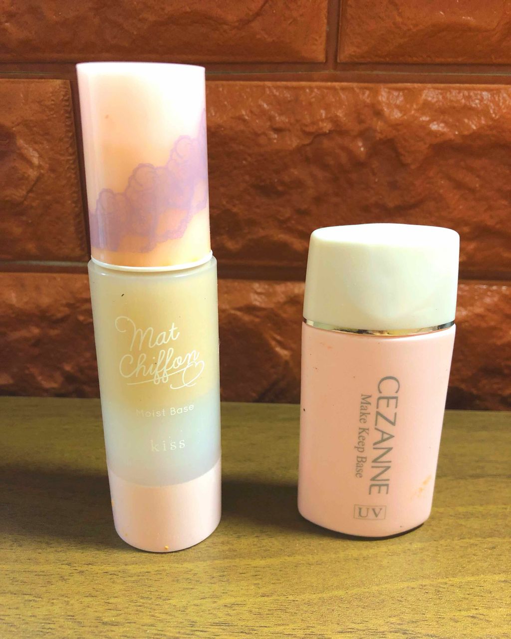 下地シリーズ!左がキスマットシフォンUVモイストベース02ナチュラルSPF26PA++右がセザンヌ皮脂テカリ防止下地この2つがテカリにくくてヘビロテ!キスの方は真空なのとSPFが入ってるから時期的にもすごい良い🤤セザンヌはもー安定すぎてなにも...