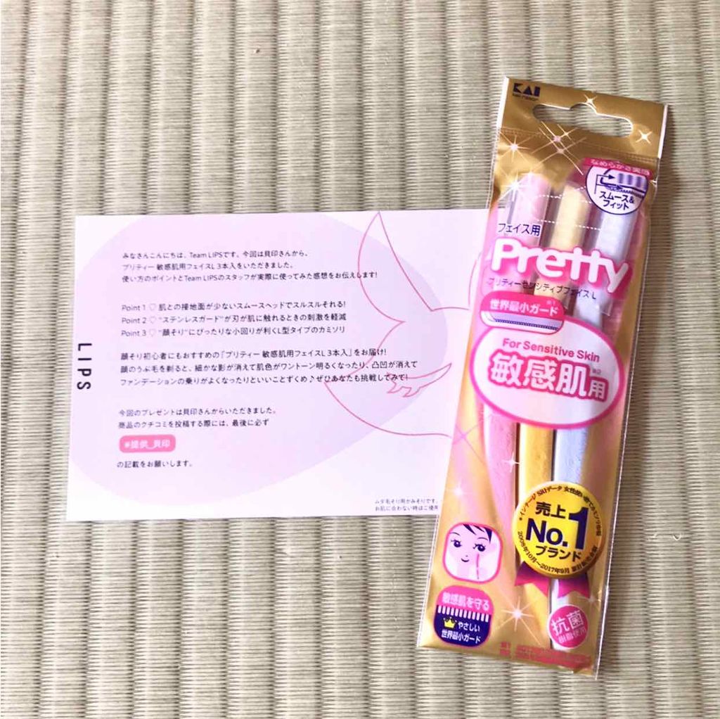 KAIrazorPrettyプリティー敏感肌用フェイスL試供品(非売品)顔のお手入れに敏感肌※にも優しいガード付き※カミソリの物理的な刺激による。使ってみた感想です。ピンク色で可愛いからお気に入り。柄も入ってるからいいですね。しっかりとムダ毛...