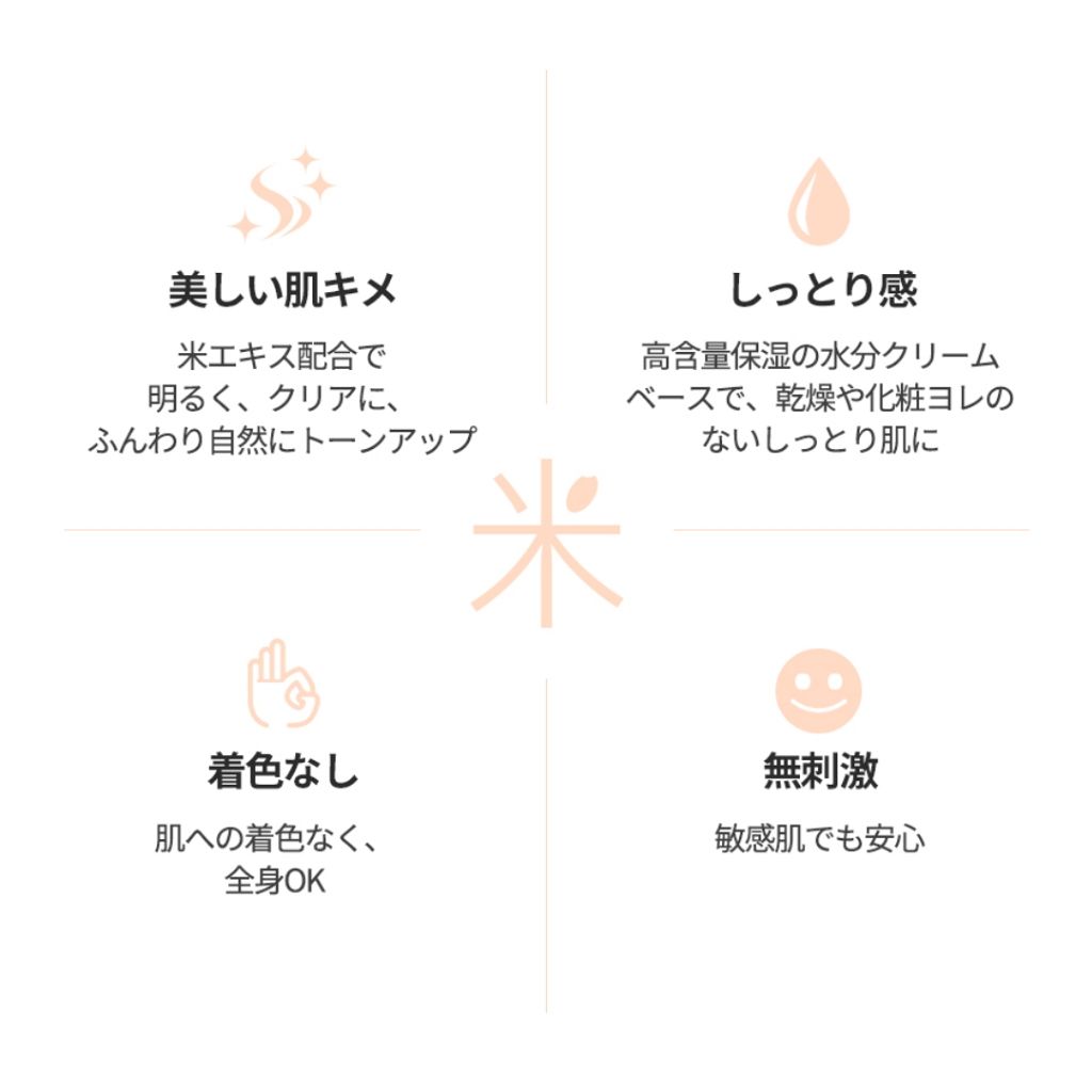 - キメの整ったクリアな白肌(※)を演出してくれる、お米由来のトーンアップ(※)クリーム。 コメエキス(整肌・保湿成分)が、キレイ見せを叶えながら肌にツヤとうるおいを与えてなめらかな美肌に整えてくれます。 肌にピタッと密着するテクスチャーで、顔とボディの両方に使用可能。 ※ メイクアップ効果による