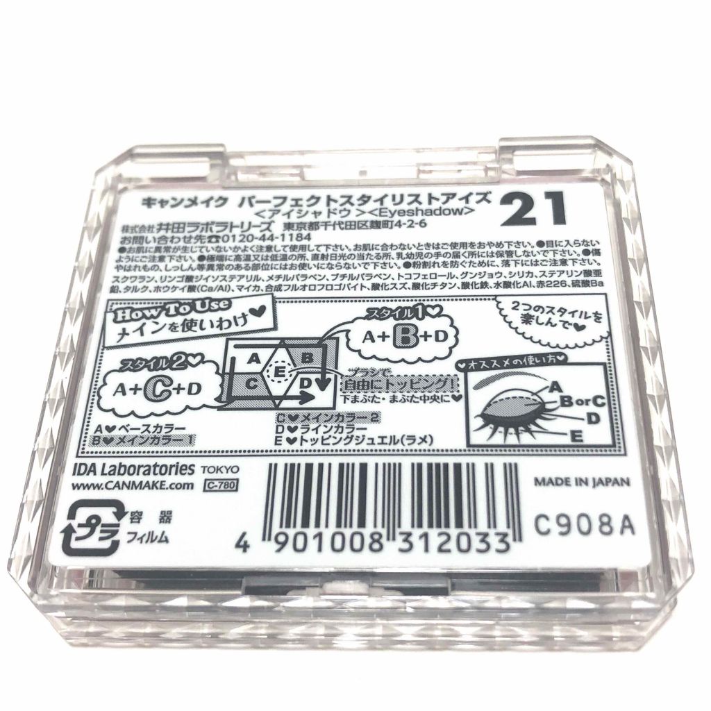 ☆キャンメイクパーフェクトスタイリストアイズ旧品No.10スウィートフラミンゴリンゴ酸ジイソステアリル、スクワラン、ブチルパラベン、メチルパラベン、トコフェロール、カルミン、シリカ、ステアリン酸亜鉛、タルク、ホウケイ酸(Ca/AI)、マイカ、...