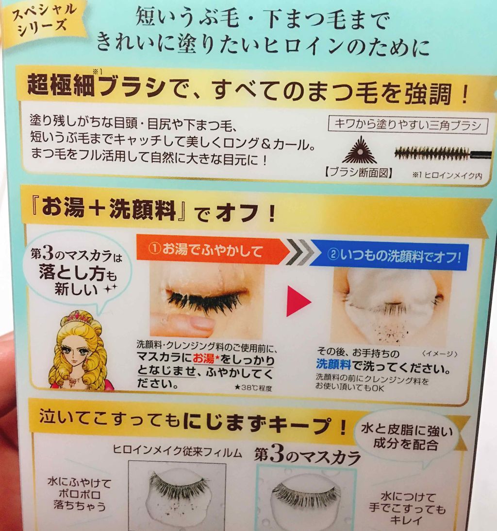 - ■超極細※1ブラシで、すべてのまつ毛を強調 塗り残しがちな目頭や目尻、下まつ毛、短いうぶ毛まで根こそぎキャッチして美しいロング&カールまつ毛に導きます。まつ毛1本1本をフル活用して自然に大きな目もとが叶います。 ※1 ヒロインメイク内 ■水・皮脂・こすれに強くにじまないのに、お湯+洗顔料で簡単オフ 第3のマスカラは、水・皮脂に強い成分にプラスして洗顔料で落とせる成分を配合した新処方。今までのフィルムタイプマスカラに見られた、にじみやポロポロ落ちのない耐久性の高さを実現しながらも、お湯と洗顔料で簡単にオフが可能です。 ■長時間上向きまつ毛をキープ 塗った瞬間にまつ毛が湿ってカールが落ちることがなく、上向きのぱっちりまつ毛を長時間キープします。 ・瞬間ロック成分 塗った瞬間にさっと乾いて、カールしたまつ毛を強力に固定します。 ・形状持続ポリマー 塗布後に固まって皮膜を形成し、上向き形状が持続します。 ■4種のまつ毛美容液成分配合 ツバキオイル・アルガンオイル・ローヤルゼリーエキス・野バラオイル※2(まつ毛保護成分)配合。 ※2 カニナバラ果実油
