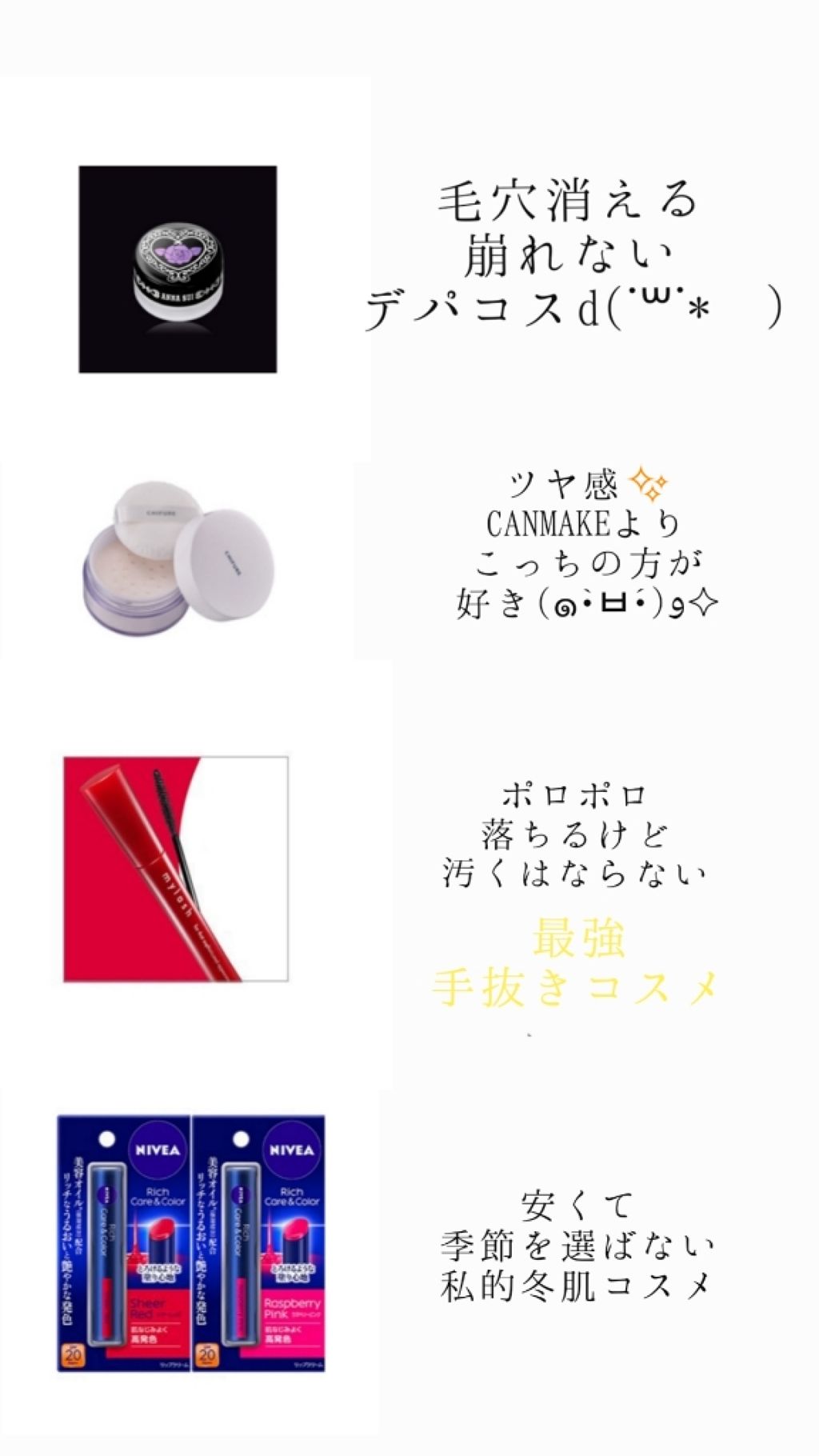 <私的絶対コスメ>これは絶対いる!!!!的なコスメファンデとアイシャドウとチークはぶっちゃけ合ってるのか分からないので書いてないです・ANNASUIポアスムージングプライマーどこかで見たのですが、毛穴が浅い人は硬いプライマーの方がいいとか…こ...