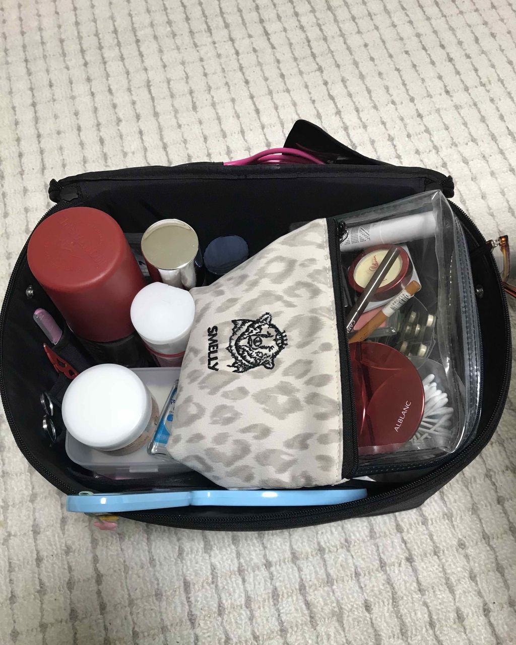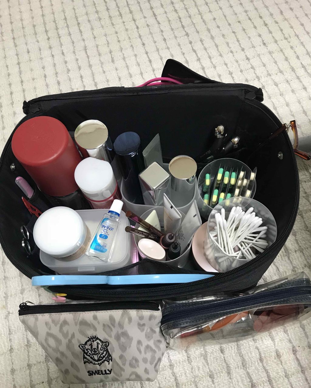 無印良品のナイロンメイクボックスはとても大きくて、しっかりしています! 仕切りが無いため、ポリプロピレンメイクボックスでシンデレラフィット😳 これなら使いたいものがすぐに見つけられます! ブラシ用のポケットやちょっとしたサンプルを入れられるポケットがあるのも便利です🫶 見せる収納ではなく、片付けれてたらいいや〜のズボラさんにはもってこいです👍