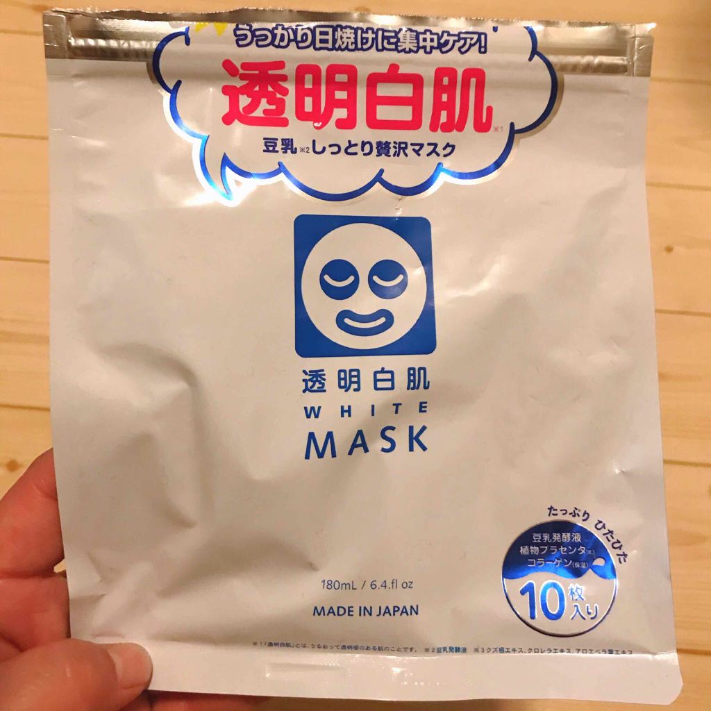 10枚入りで税込660円なんてかなり安いですよね。 しかも日本製! 豆乳発酵液などが配合されていて、保湿しつつ透明感のあるお肌に導いてくれるそう。 厚手のマスクに乳白色の美容液ヒタヒタ。 香りはついてなくて、結構アルコールの香りがします。
