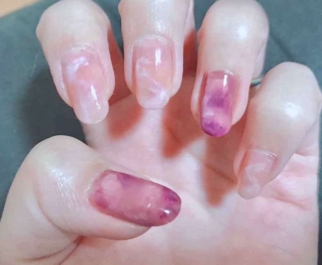 100円ネイルでセルフネイル💅簡単大理石ネイル!ダイソーのジェネネイルとキティネイルを使用しました!➀ベースの色を塗ります。➁ベースの色が乾いたら、キティネイルの黒の細筆又は白の細筆をトップコートで色を薄めて波の様な線を描きます。本当にうっす...