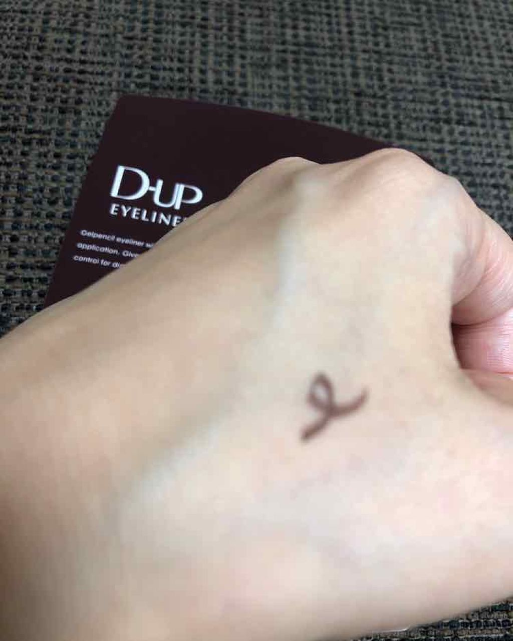 するする書ける繰り出しタイプのジェルライナーです 使用感はとてもよく、落ちにくくてさすがD-UPと思いました! 色味はピーチブラウンなのですが、ほんのり赤みを感じるかなという感じで、結構ブラウンブラック寄りで、ピーチ感は感じませんでした。