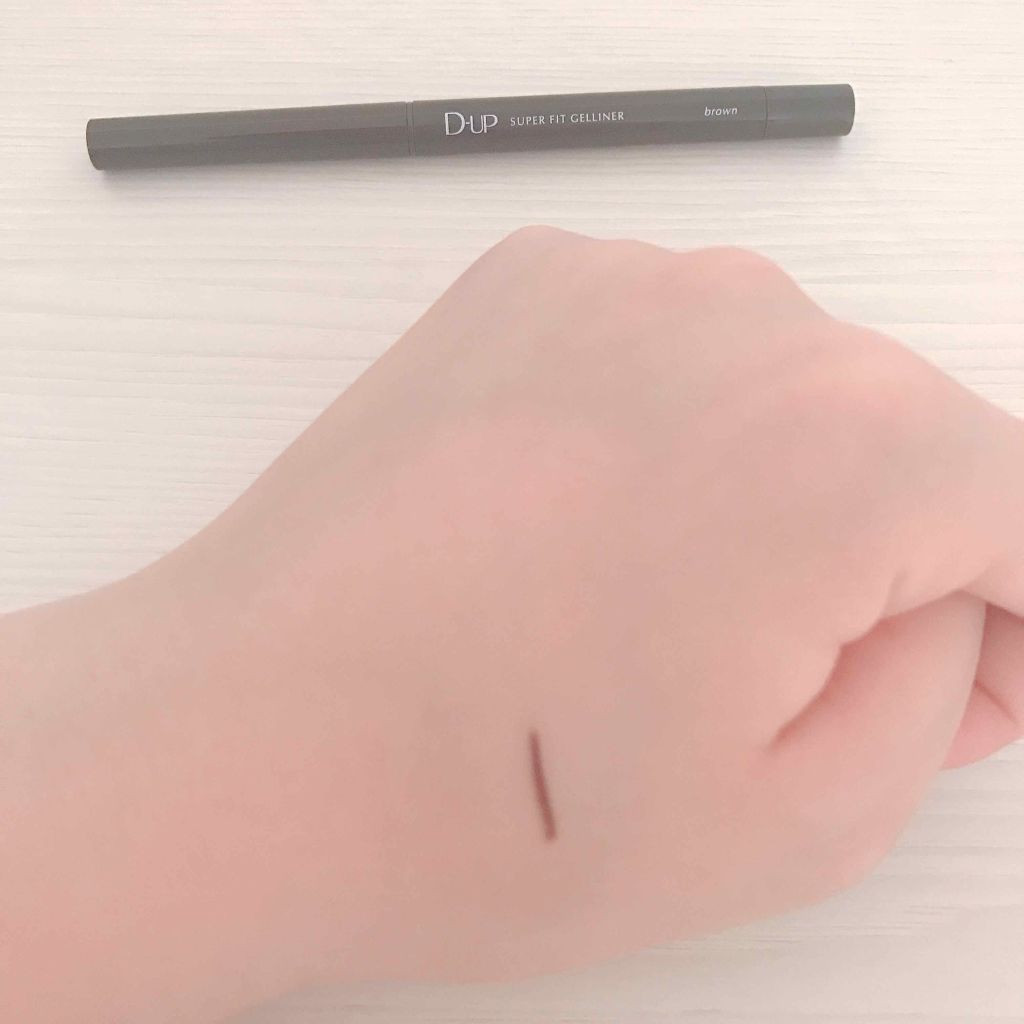 するする書ける繰り出しタイプのジェルライナーです 使用感はとてもよく、落ちにくくてさすがD-UPと思いました! 色味はピーチブラウンなのですが、ほんのり赤みを感じるかなという感じで、結構ブラウンブラック寄りで、ピーチ感は感じませんでした。