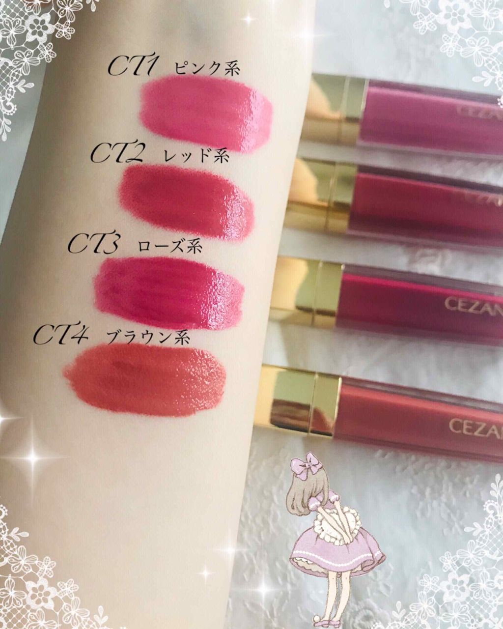 - <CT2 レッド系> ワセリン、ミネラルオイル、水添ポリイソブテン、トリイソステアリン酸ポリグリセリル-2、マイクロクリスタリンワックス、(パルミチン酸/エチルヘキサン酸)デキストリン、パルミチン酸デキストリン、(VP/エイコセン)コポリマー、シア脂、カニナバラ果実油、ヒアルロン酸Na、グリチルレチン酸ステアリル、ジメチコン、トコフェロール、エチルヘキシルグリセリン、フェノキシエタノール、(+/-)合成フルオロフロゴパイト、ジメチルシリル化シリカ、マイカ、硫酸Ba、水酸化Al、メチコン、(チタン/酸化チタン)焼結物、トリエトキシカプリリルシラン、酸化チタン、酸化鉄、グンジョウ、赤201、赤202、赤223 <CT4 ブラウン系> ワセリン、ミネラルオイル、ポリブテン、リンゴ酸ジイソステアリル、トリイソステアリン酸ポリグリセリル-2、パルミチン酸デキストリン、マイクロクリスタリンワックス、(VP/ヘキサデセン)コポリマー、ジメチルシリル化シリカ、シア脂、ヒアルロン酸Na、カニナバラ果実油、スクワラン、オリーブ果実油、ホホバ種子油、マカデミア種子油、ポリエチレン、ジメチコン、フェノキシエタノール、トコフェロール、(+/-)硫酸Ba、酸化チタン、水酸化Al、酸化鉄、赤202、赤223、黄4、青1 <CT6 コーラル系> ワセリン、ミネラルオイル、ポリブテン、リンゴ酸ジイソステアリル、トリイソステアリン酸ポリグリセリル-2、パルミチン酸デキストリン、マイクロクリスタリンワックス、(VP/ヘキサデセン)コポリマー、ジメチルシリル化シリカ、シア脂、ヒアルロン酸Na、カニナバラ果実油、スクワラン、オリーブ果実油、ホホバ種子油、マカデミア種子油、ポリエチレン、ジメチコン、フェノキシエタノール、トコフェロール、(+/-)硫酸Ba、酸化チタン、水酸化Al、酸化鉄、合成フルオロフロゴパイト、酸化スズ、赤202、赤223、黄4、青1