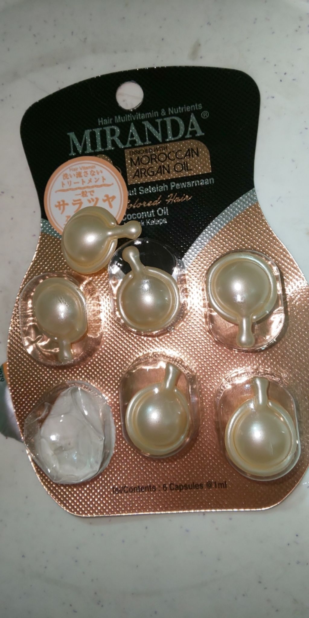 キャンドゥーで売ってた、ヘアオイル。MIRANDAヘアビタミンモイスチャーヘアオイルオリーブオイル、アロエベラモロッコ アルガンオイルが入っているみたい。バリ島のヘアオイルみたいです。使い心地は良かったです。べたつきすぎず髪洗った後乾かす前に...