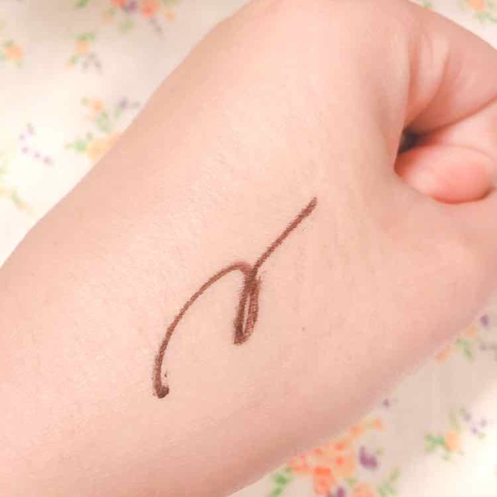 するする書ける繰り出しタイプのジェルライナーです 使用感はとてもよく、落ちにくくてさすがD-UPと思いました! 色味はピーチブラウンなのですが、ほんのり赤みを感じるかなという感じで、結構ブラウンブラック寄りで、ピーチ感は感じませんでした。