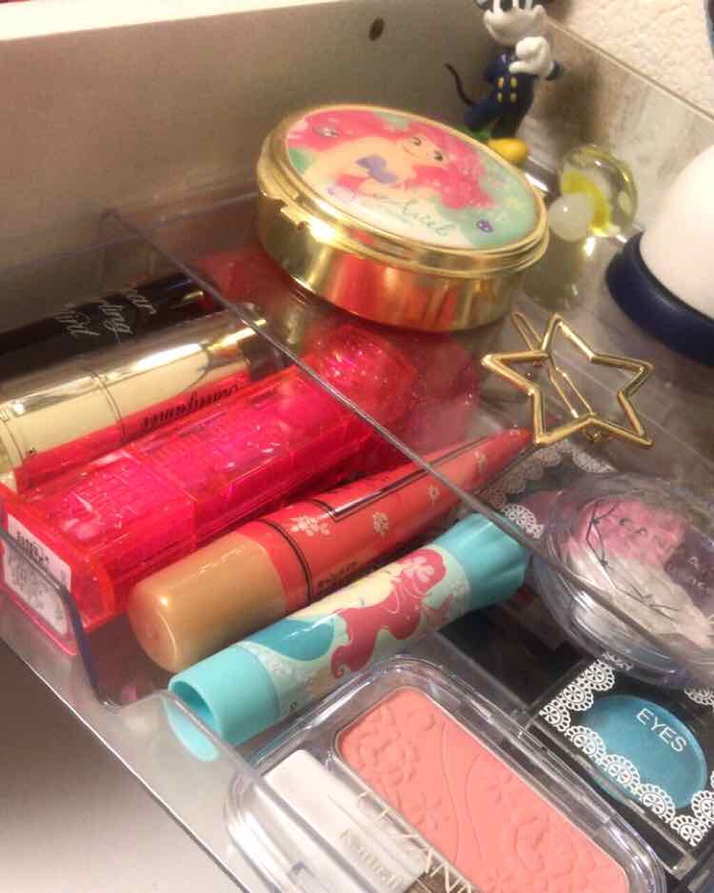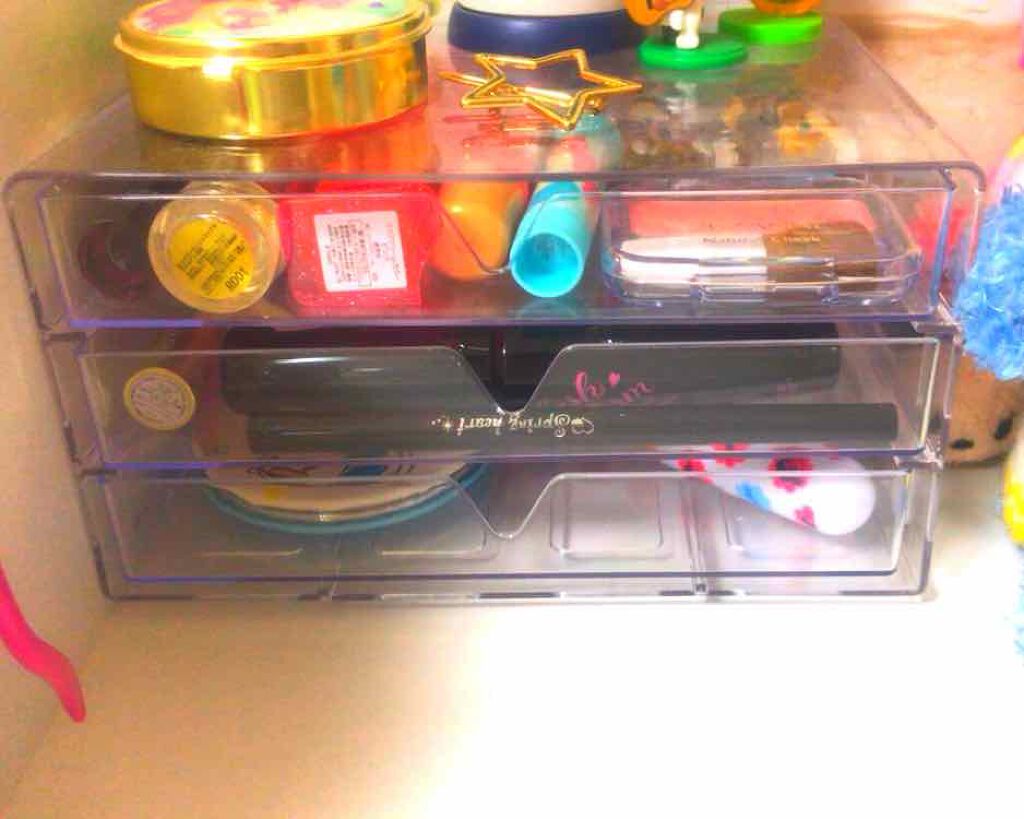 コスメ収納紹介3段クリアケース以外も多分ダイソーだけどもう売っていないかもおでかけ用お泊り用ポーチとその他パック以外はほぼ全て大集合低めの机だから置いてあるだけでメイクは別の場所へ推し活とコスメが両立出来るようコスメの数を減らしてグッズを置け...