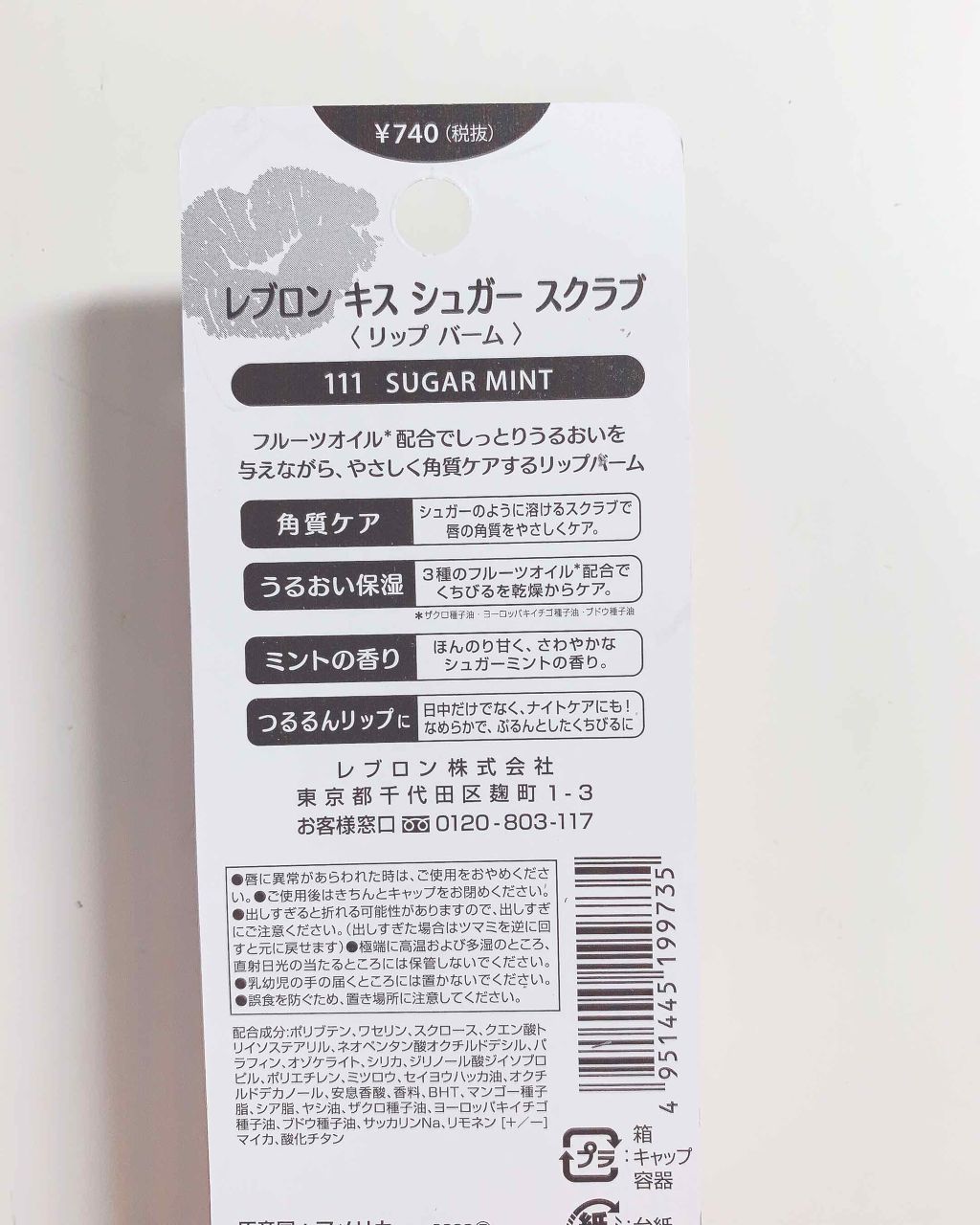 寝る前のリップケア。翌日薄皮ペロンってむけてぷるんってなるんよ。 使い心地がREVLONが一番好き。スクラブとバームの割合が悪いやつあったりするけど、今回はいい配分で文句なし。 シュガーミントが甘くていい香りだと思うー。まぁ好みですけどね。