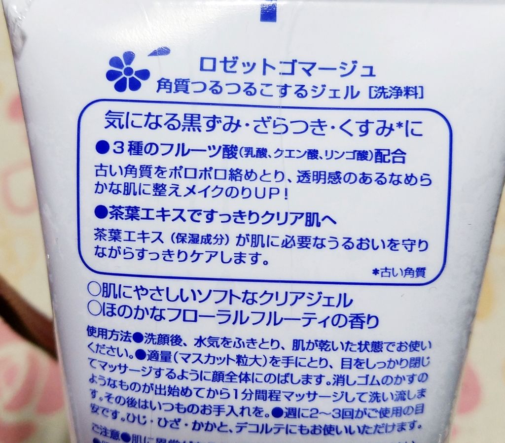 - <ロゼットゴマージュ> 水、ステアルトリモニウムクロリド、カルボマー、エタノール、炭、カオリン、乳酸、クエン酸、リンゴ酸、海泥抽出物、アラントイン、チャ葉エキス、グルコース、DPG、香料、フェノキシエタノール