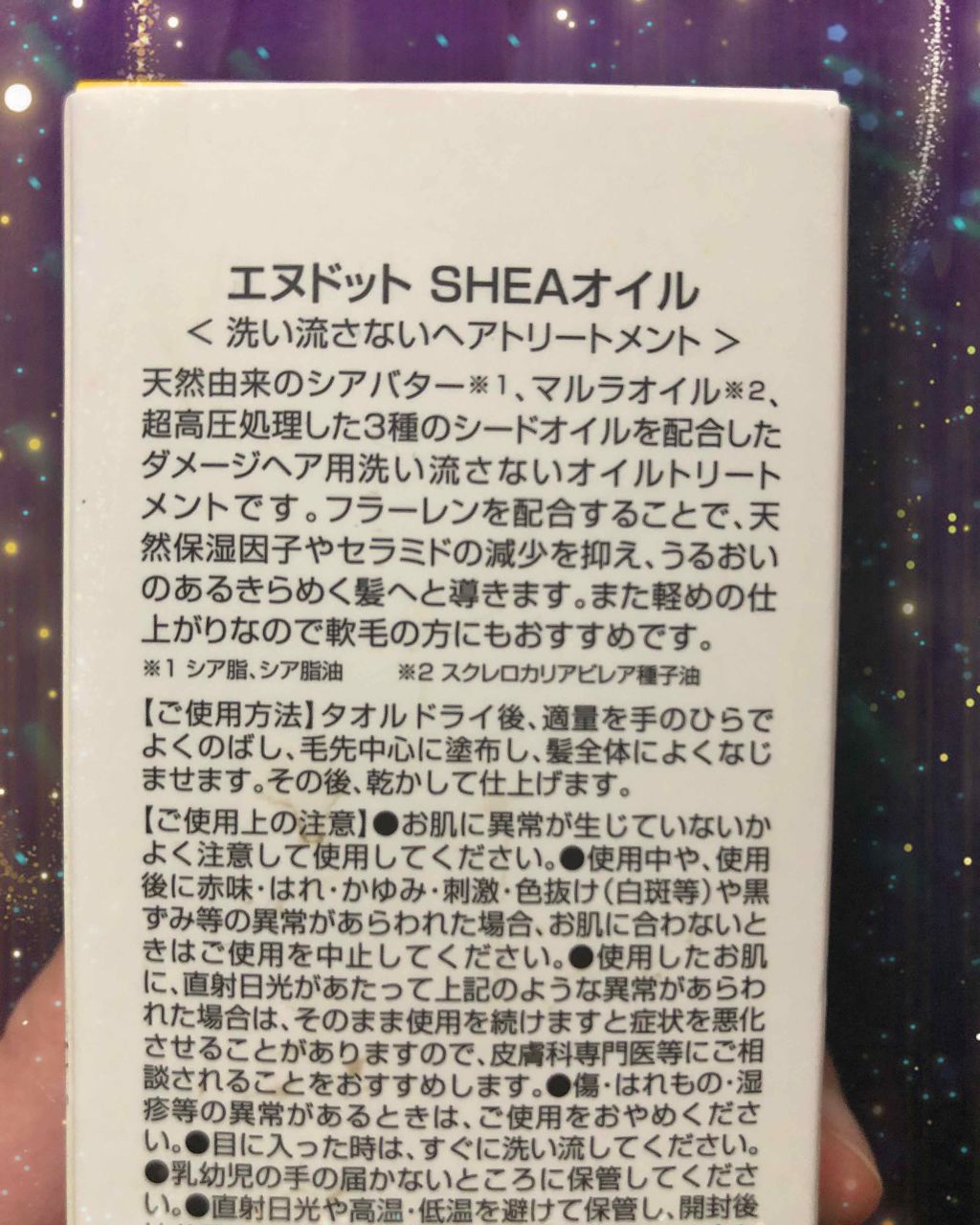 - <150ml> シクロペンタシロキサン、ジメチコン、ジネオペンタン酸ジエチルペンタンジオール、ミリスチン酸イソプロピル、イソノナン酸イソノニル、ジメチコノール、フェニルトリメチコン、スクワラン、シア脂、シア脂油、スクレロカリアビレア種子油、アルガニアスピノサ核油、ブドウ種子油、マカデミアナッツ油、フラーレン、テトラヘキシルデカン酸アスコルビル、メトキシケイヒ酸エチルヘキシル、t-ブチルメトキシジベンゾイルメタン、BHT、香料