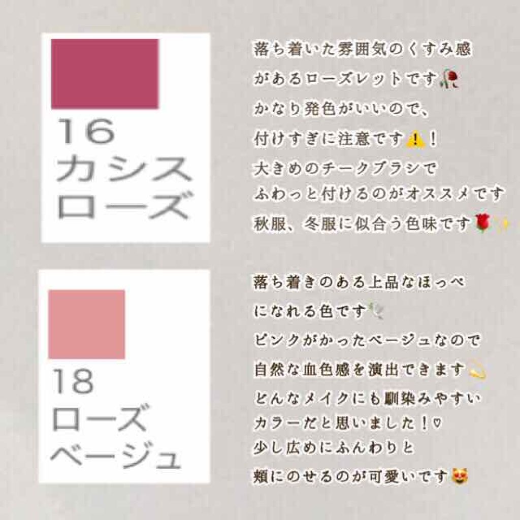 | チークランキング第6位 | しっとりとした質感で肌に馴染みます♪ 季節やパーソナルカラー問わず使えそう❤︎ | 詳細を見る | |