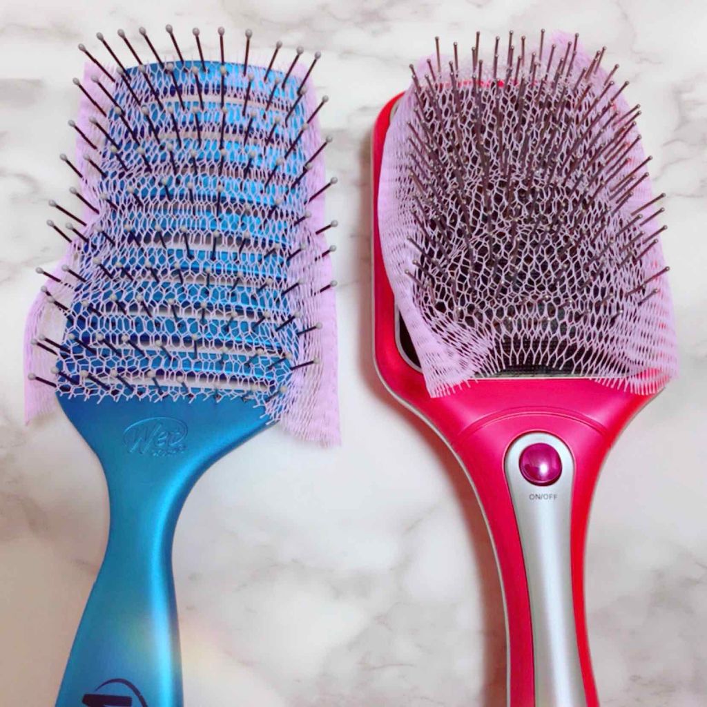 ブラシケアネットを上からブラシに差し込んで使うことで、ネットを外す時に髪の毛やほこりをまとめて取ることができます✨ 差し込み、取り外しは簡単。 ピンクのネットで差し込むと少し見た目は不気味ですが、掃除する手間がなくなり便利です☺️ 40枚入りで¥110なのでコスパは良いと思います🙆♀️