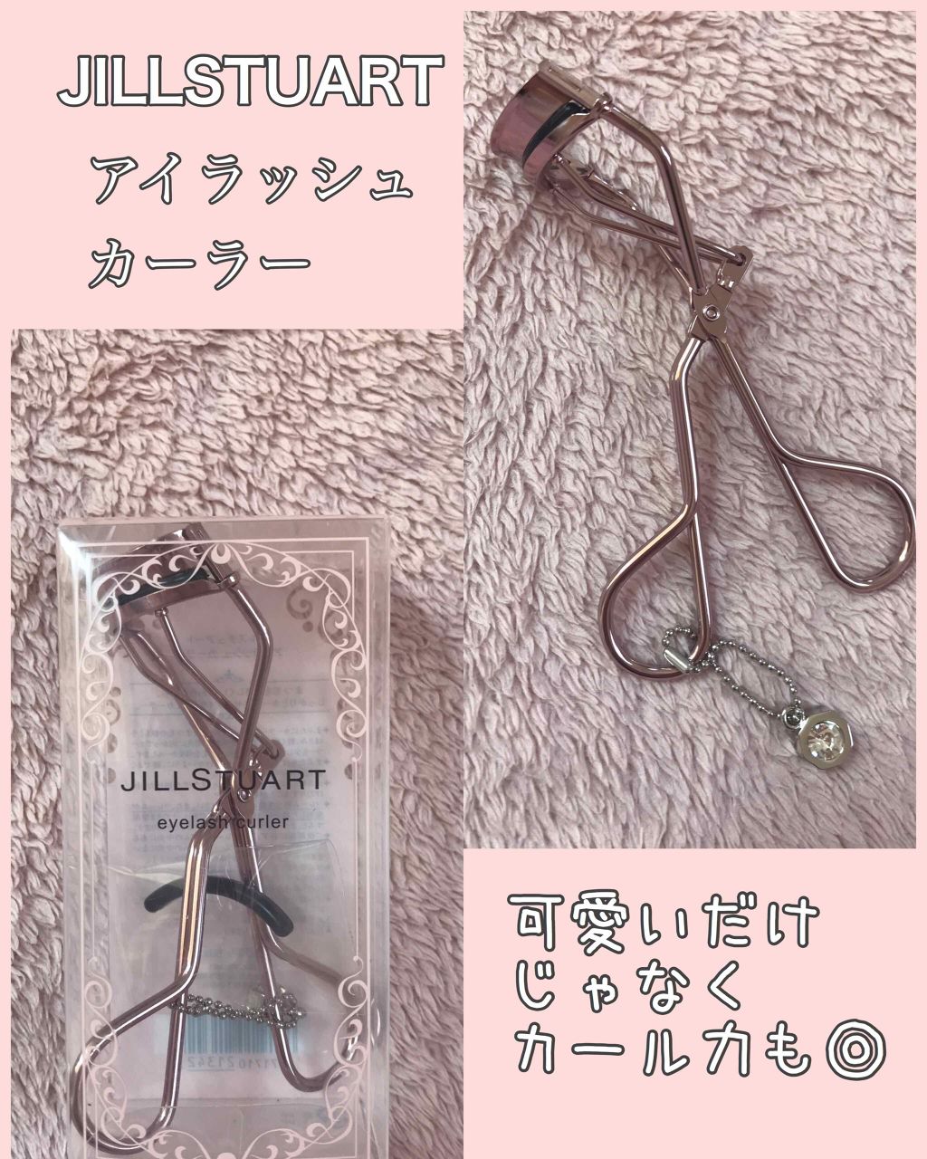 結構カーブ強めなビューラー。これを使う前は資生堂のビューラーを使っていたのだけど、パケが可愛いのとカーブ強めなビューラーが欲しくてJILLSTUARTのものを選んでみました。 ピンクゴールドで、チャームが付いていて可愛い🥰 使っているだけで嬉しい🥰 過去に使っていたビューラーよりもくるんとまつ毛を挟める感じがする😊