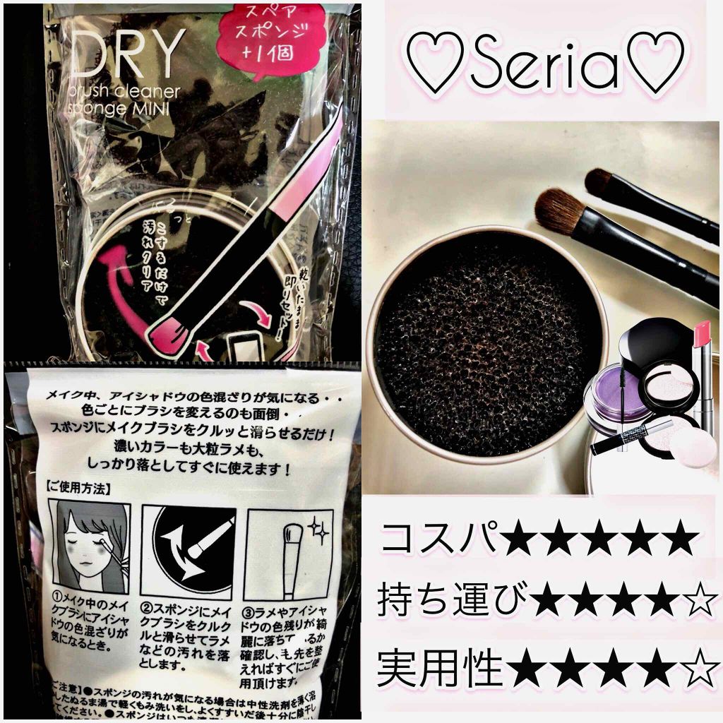 アイシャドウとかの色とかラメをいちいちティッシュで拭き取って使ってたよ〜。セリアでドライメイクブラシクリーナーなるものを発見!小さいサイズもありました。それは携帯用に良さそう。これは便利〜。くるくるするとブラシについたラメや色が取れる!スポン...