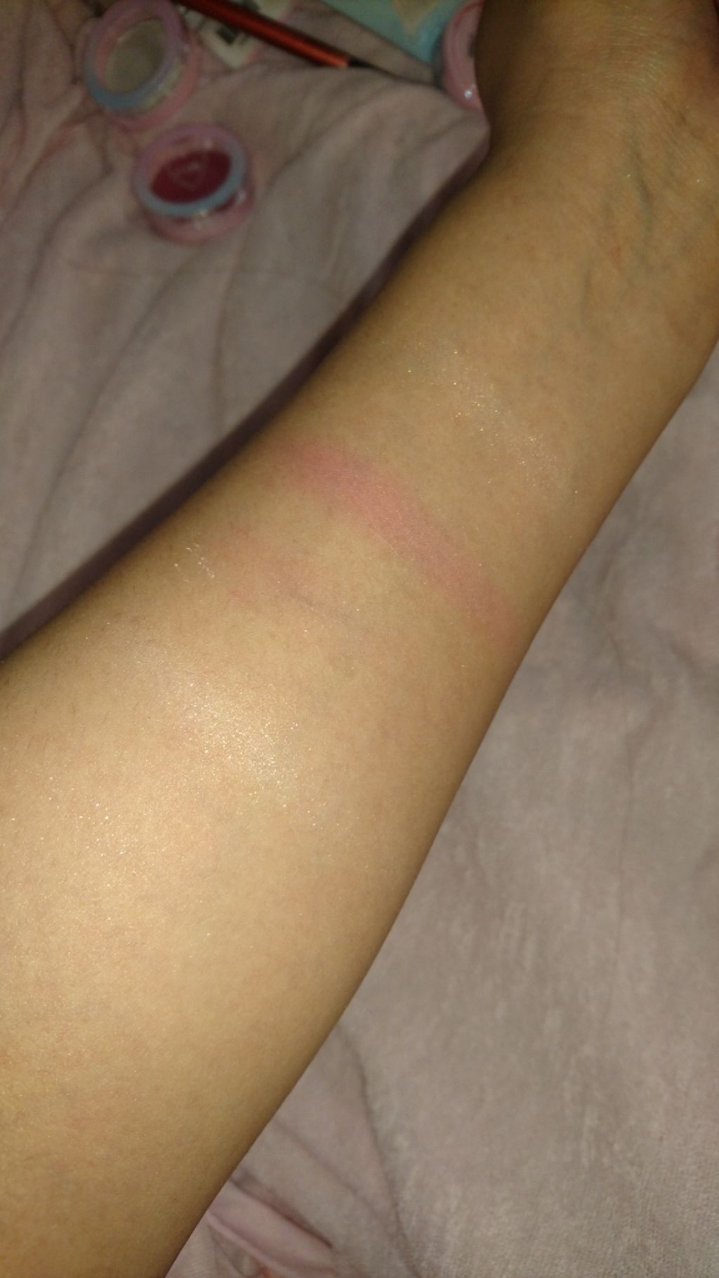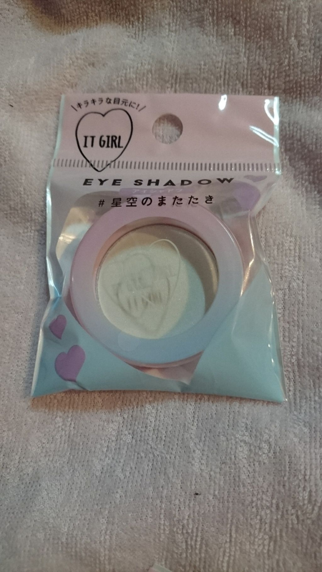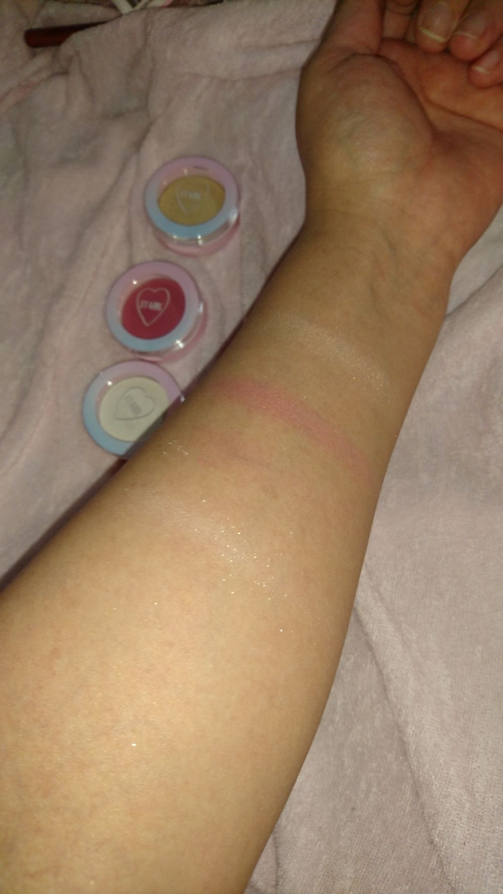 ITGIRLアイシャドウ#猫かぶりお色味が可愛い!と思って購入しました。ほんのりピンクっぽく涙袋に使ったら可愛いと思います。腕にのせるとこんな感じです。凄くキラキラしてラメが沢山入ってるのが分かります。...