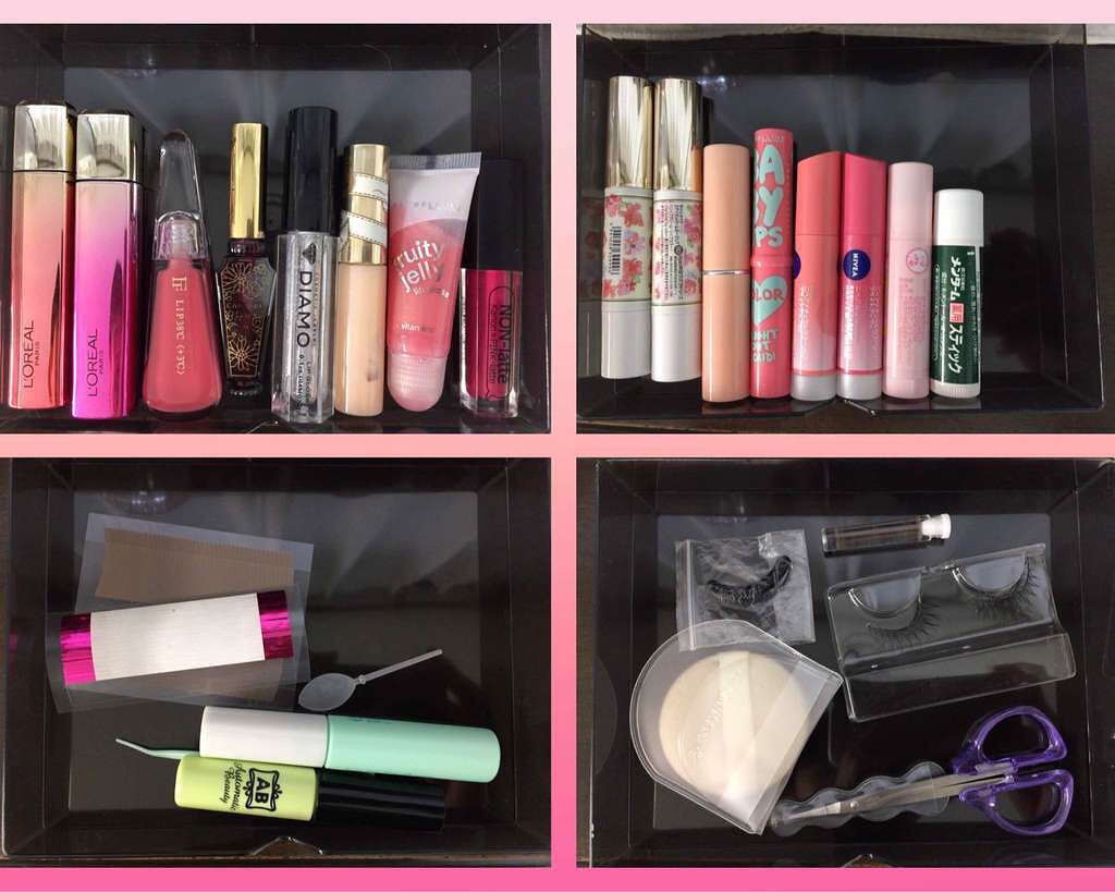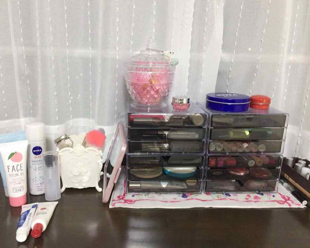 カラーボックスを横に使用。そこに突っ張り棒でカフェカーテンをつけてます。 引き出しは全てDAISOのもの。アイシャドウや普段あまり使わないカラーライナー、カラーマスカラ、下地等を収納。 ディズニーのお菓子のケースです🍭 結構大きくて急いでいるときでもここから取り出してささっとファンデをすませます!