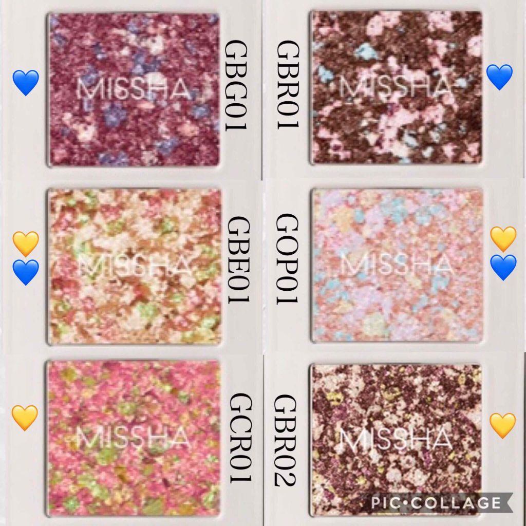 桜葉🌸です買いましたよ!!MISSHAのギラギラシャドウ!!!私が何回も投稿してるMISSHAのグリッタープリズムシャドウ今回は日本限定色です💓ラインナップは⬇️GBG01GOP01GBR01GBE01GCR01GBR02の6色な日本限定色で...
