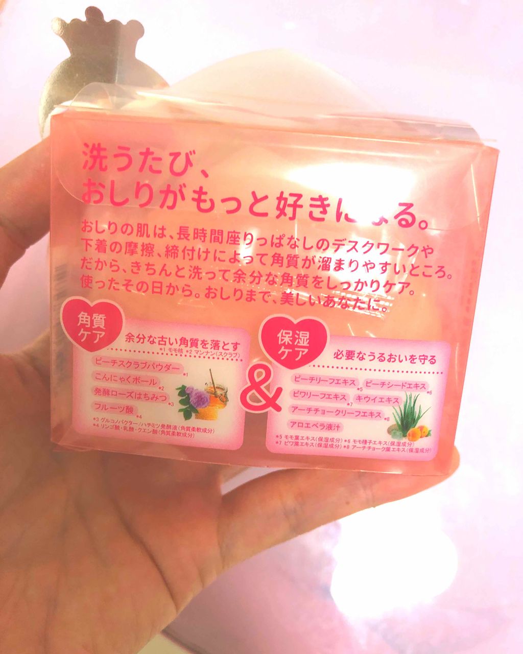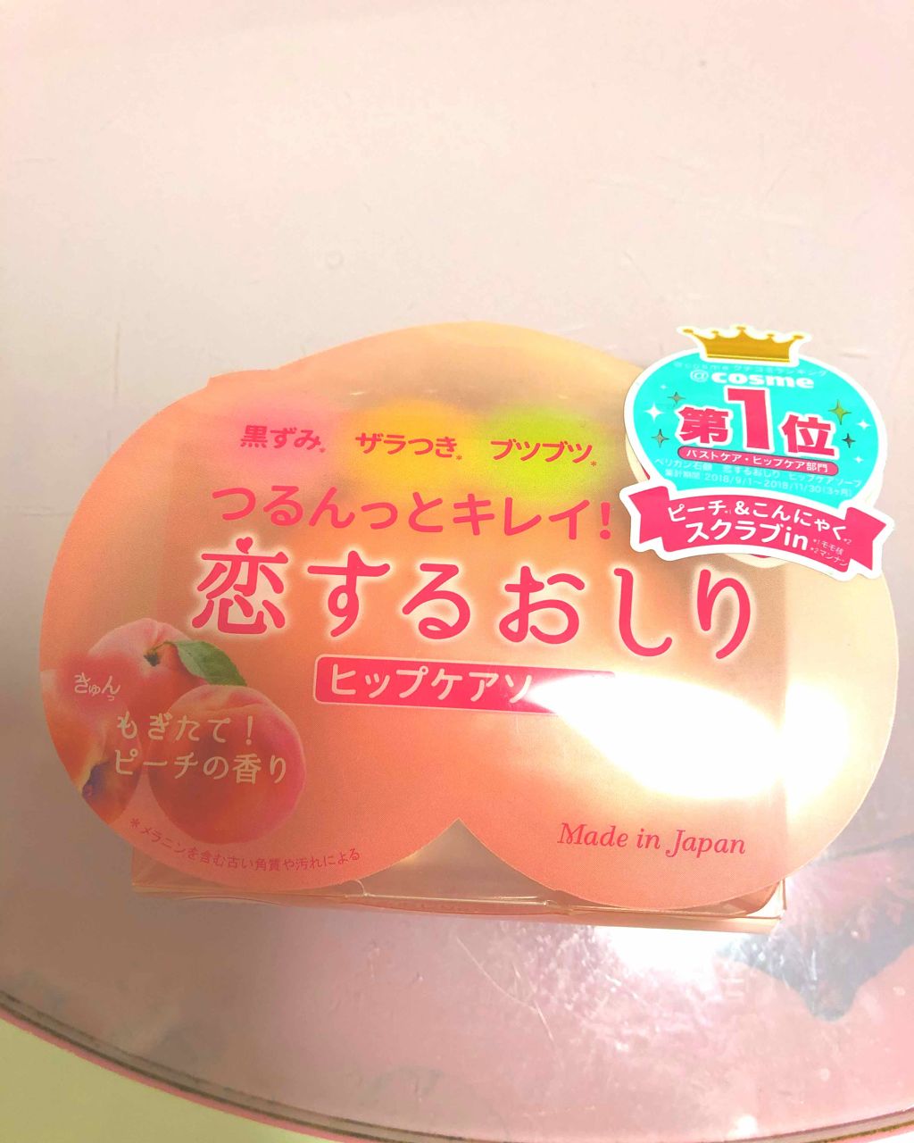 - 恋するおしり ヒップケアソープ おしりの黒ずみ・ザラつき・ブツブツにくるくる直接洗いの簡単ケア! (1)余分な古い角質を落とす:角質ケア スクラブ※1&ピーリング成分※2配合 【モモ核、マンナン※1 グルコノバクター/ハチミツ発酵液、 リンゴ酸・乳酸・クエン酸※2】 (2)必要なうるおいを守る:保湿ケア 6種※3の美容保湿エッセンスを配合 【モモ葉エキス、モモ種子エキス、ビワ葉エキス、キウイエキス、 アーチチョーク葉エキス、アロエベラ液汁※3】 ◎「きゅんっ」とする もぎたて!ピーチの香り