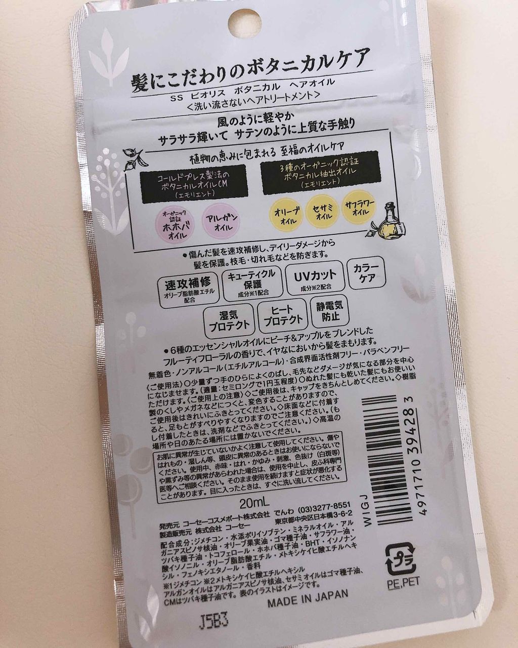 - 傷んだ髪も速攻補修し驚くほどに軽やかでサラサラまとまる髪へ ・コールドプレス製法のボタニカルオイルCM(エモリエント)配合(オーガニック認証ホホバオイル、アルガンオイル) ・3種のオーガニック認証ボタニカル抽出オイル(エモリエント)配合(オリーブオイル、セサミオイル、サフラワーオイル) ・傷んだ髪を速攻補修し、デイリーダメージから髪を保護。枝毛・切れ毛などを防ぎます ・速攻補修(オリーブ脂肪酸エチル配合)、キューティクル保護(成分※1配合)、UVカット(成分※2配合)ヒートプロテクト、湿気プロテクト、静電気防止、カラーケア ・6種のエッセンシャルオイルにピーチ&アップルをブレンドしたフルーティフローラルの香りで、イヤなにおいから髪をまもります ・無着色・ノンアルコール(エチルアルコール)・合成界面活性剤フリー・パラベンフリー ※1ジメチコン ※2メトキシケイヒ酸エチルヘキシル アルガンオイルはアルガニアスピノサ核油、セサミオイルはゴマ種子油、CMはツバキ種子油です