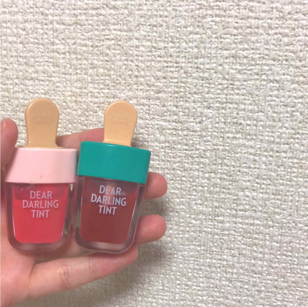 エチュードディアダーリンウォータージェルティントカラーPK004アズキバーアイスバーをモチーフとしたパッケージが可愛くて購入♪フルーツ系の甘い香りがするの🥰色味はピンクパープルのような落ち着いたピンクで、付けた時に色味のギャップがない仕上がり...