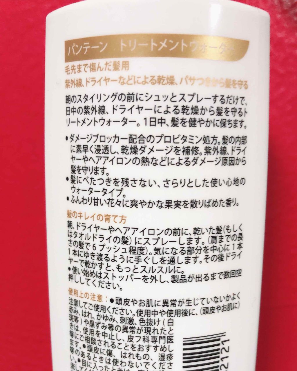 パンテーンエクストラダメージケアトリートメントウォーター毛先まで傷んだ髪用【使用方法】朝、ドライヤーやヘアアイロンの前に、乾いた髪(もしくはタオルドライの髪)にスプレーします(肩までの長さの髪で6プッシュ程度)。気になる部分を中心に1本1本に...