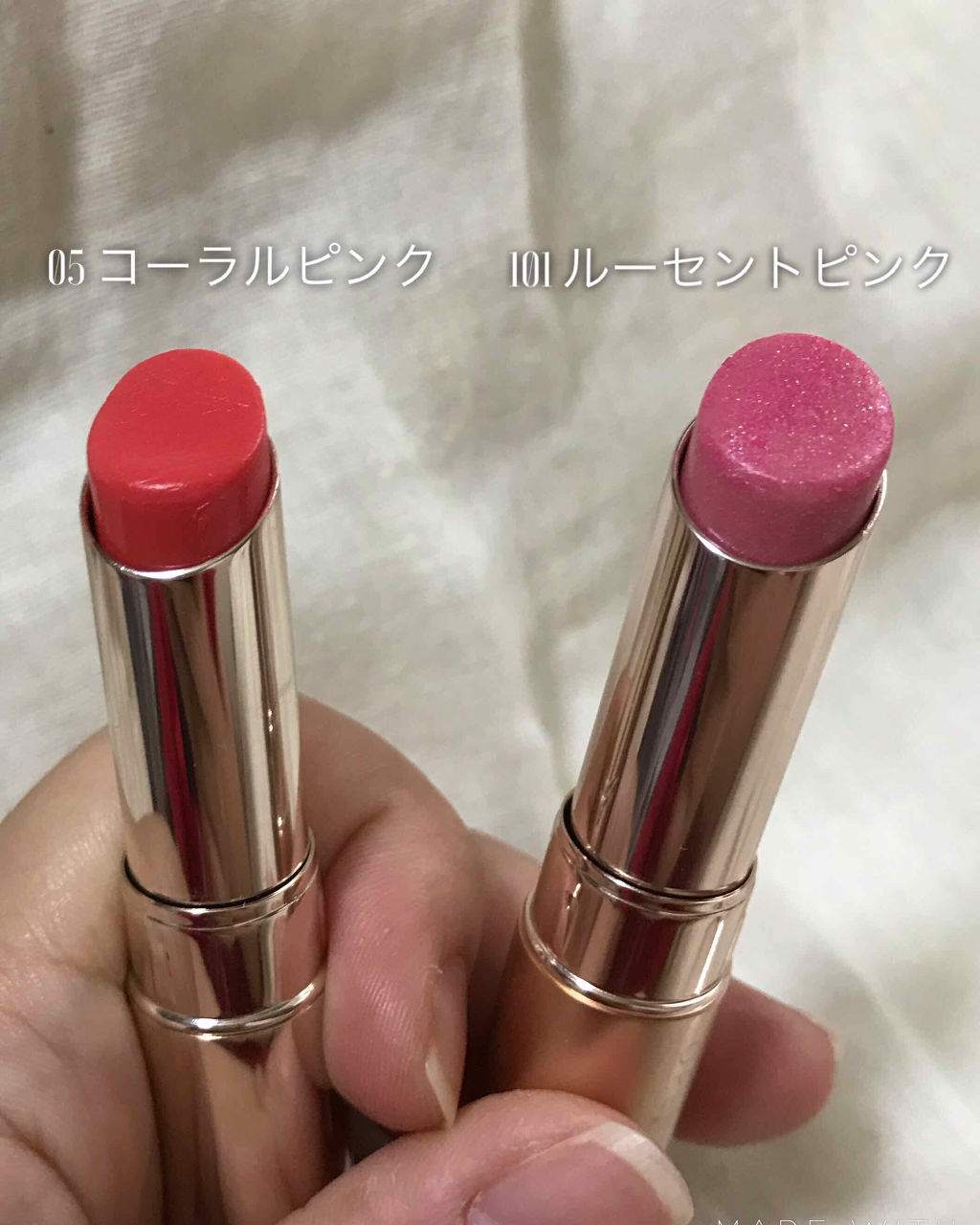 多幸感あふれるクリアなコーラル🩷 特に時間が経つと蛍光感がでてきちゃう。 THEピンクのリップを求めている人にピッタリ! ティッシュオフしても若干色は残ってる! おすすめの塗り方は、いつもよりも少し濃いめに塗ってから、ティッシュオフ!