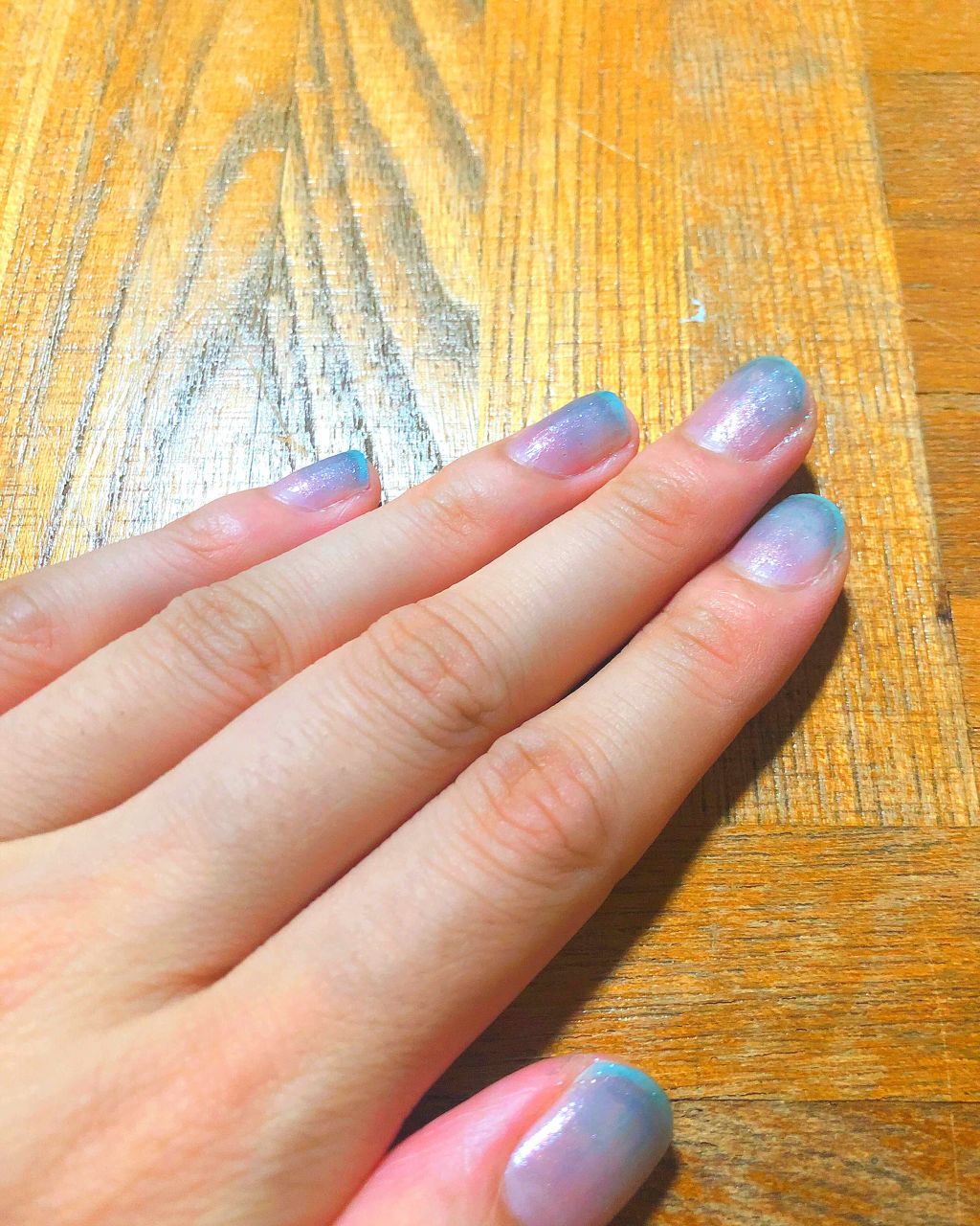 100均のマニキュア4本で作る透明感ネイル親指はチークネイルに白いマニキュアでハートそれ以外はシロップの薄い赤と青を2回ずつまだらに塗って最後に全ての爪にキラキラのマニキュアでトップコート代わりにチークネイルが難しくて大きい丸から小さく重ねて...