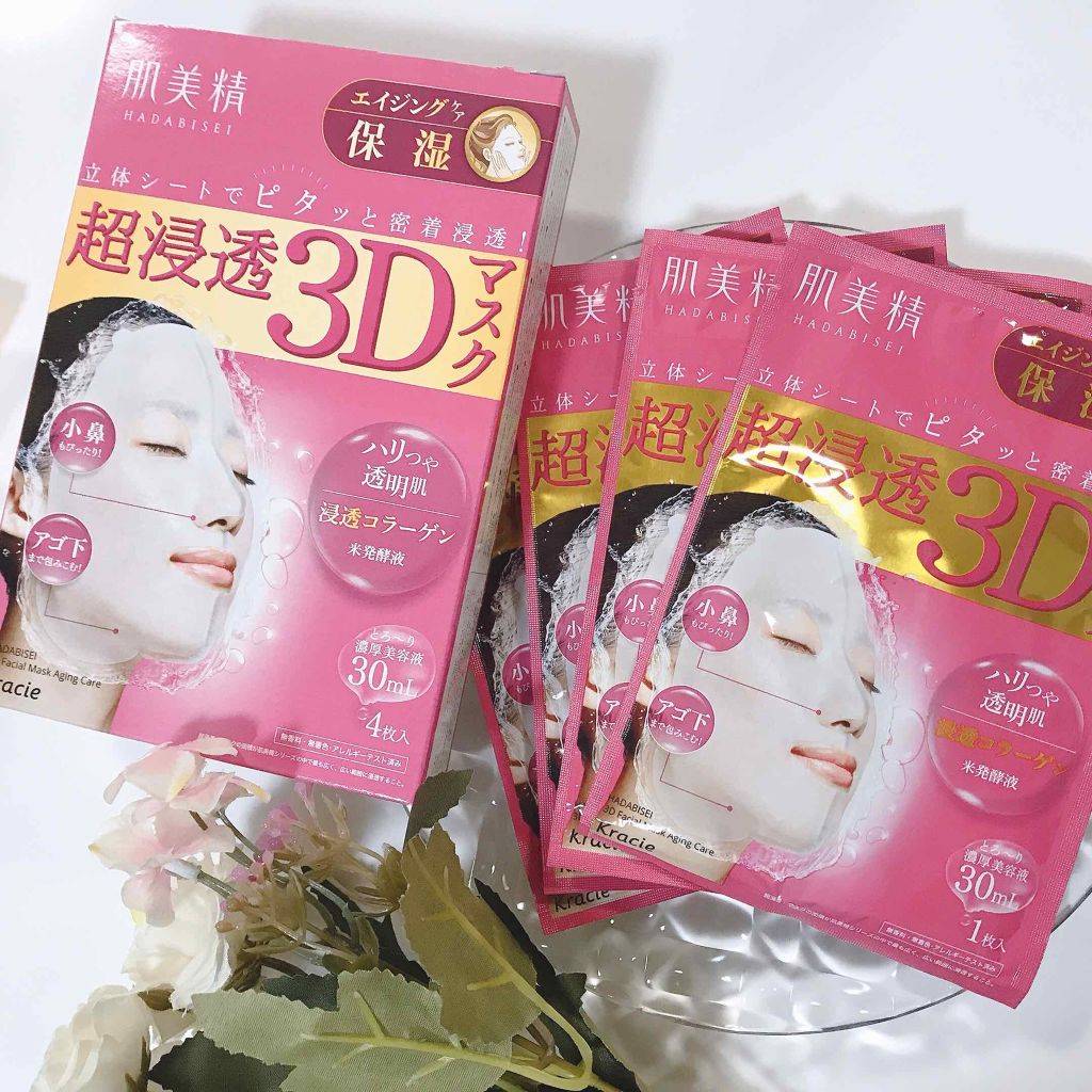 顔の凹凸にピッタリフィット!!立体形状マスク✨✨肌美精 超浸透3Dマスクエイジングケアとろみのある濃厚美容液がたっぷり30ml浸透した保湿効果の高いシートマスクです!かなりしっとりもちもちのお肌になれました♪翌朝まで潤いが続くのを実感🥹🥹あご...