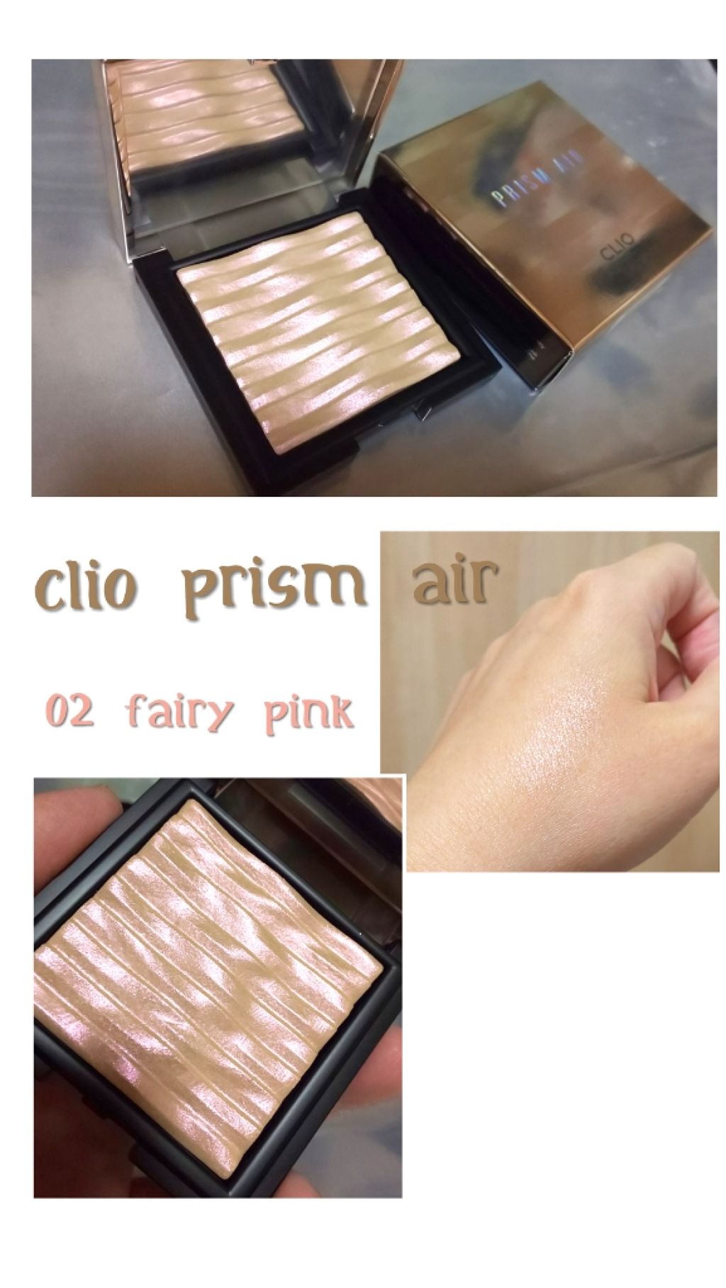 CLIOプリズムエアーハイライター02FAIRYPINK店頭で見た時に01を買ったつもりが誤って02を購入。でもこれが結果的に良かった。いわゆるピンクビーム系のハイライターで、ハイライターそのものを見た時はピンク感は薄いが、つけるとピンクだと...