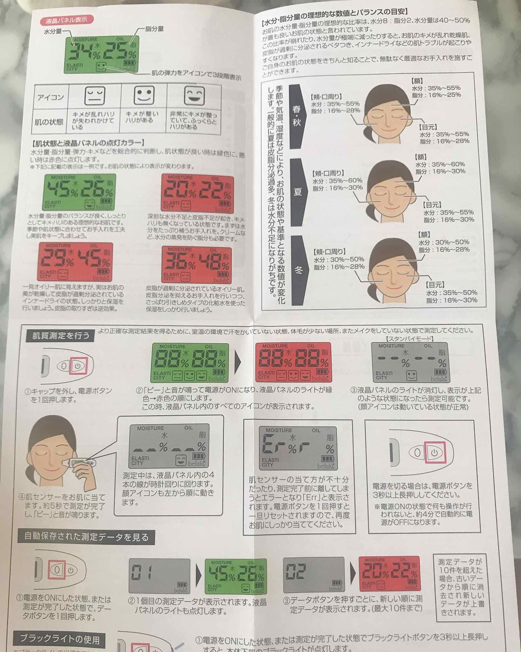 - 肌に軽く当てるだけで、水分量・油分量・弾力をスピード測定するスキンチェッカー。水分量と油分量を数値で、弾力を5段階のアイコンで表示します。10回分のデータを自動保存機能付き。