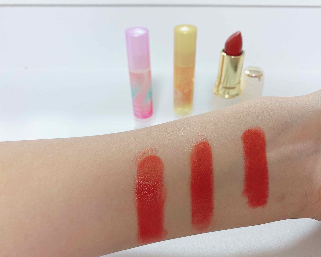 02の方が個人的に使いやすいと感じました。03はブルベ夏の方が似合いそうな色味で可愛いのですが少しオレンジっぽさもある02が気に入りました! 塗った瞬間はみずみずしく、時間が経つと艶が出てきます。(3時間くらい経つと艶感が減る気がする) 飲み食いした後は唇の内側が落ちてしました。(正直リップモンスターの方が落ちないかと…)