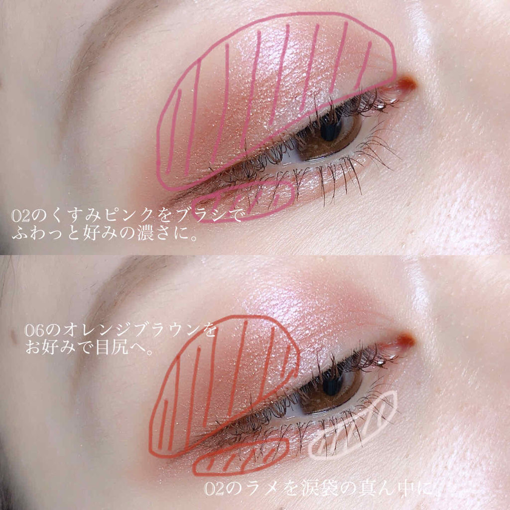 よくパレットのなかで明るいカラーをベースにまぶたに広く塗ることが多いのですが、パール感のあるカラーを避ける🙆♀️! パール感たっぷりの明るいカラーは涙袋に使うぐらい光を集めてぷっくり見せてくれるので、まぶたに広く使うと腫れぼったく見えがち😓 目元を明るくみせてくれたり、次に使うアイシャドウをぼかしやすくしてくれるけど、すっ飛ばしてメインのカラーを塗っちゃう✊🏻❤️🔥 涙袋にはたっぷり塗ってぷっくり見せる🙆♀️💕 シルキースフレアイズのマットタイプはすごく優れているな〜と感じました☺️💗 赤やオレンジなどは、入れすぎると腫れぼったく見えやすいので、見せたいカラーは下まぶた目尻にのせて色をたのしむ♡♡ パール感なしの透けマットだけじゃ物足りない… そう感じさせない華やかなラメが左上に入っているので黒目上と涙袋にのせるとすごく可愛い仕上がりに😍! 厄介な左右差のお陰でマットアイシャドウが好きになりました😌💕