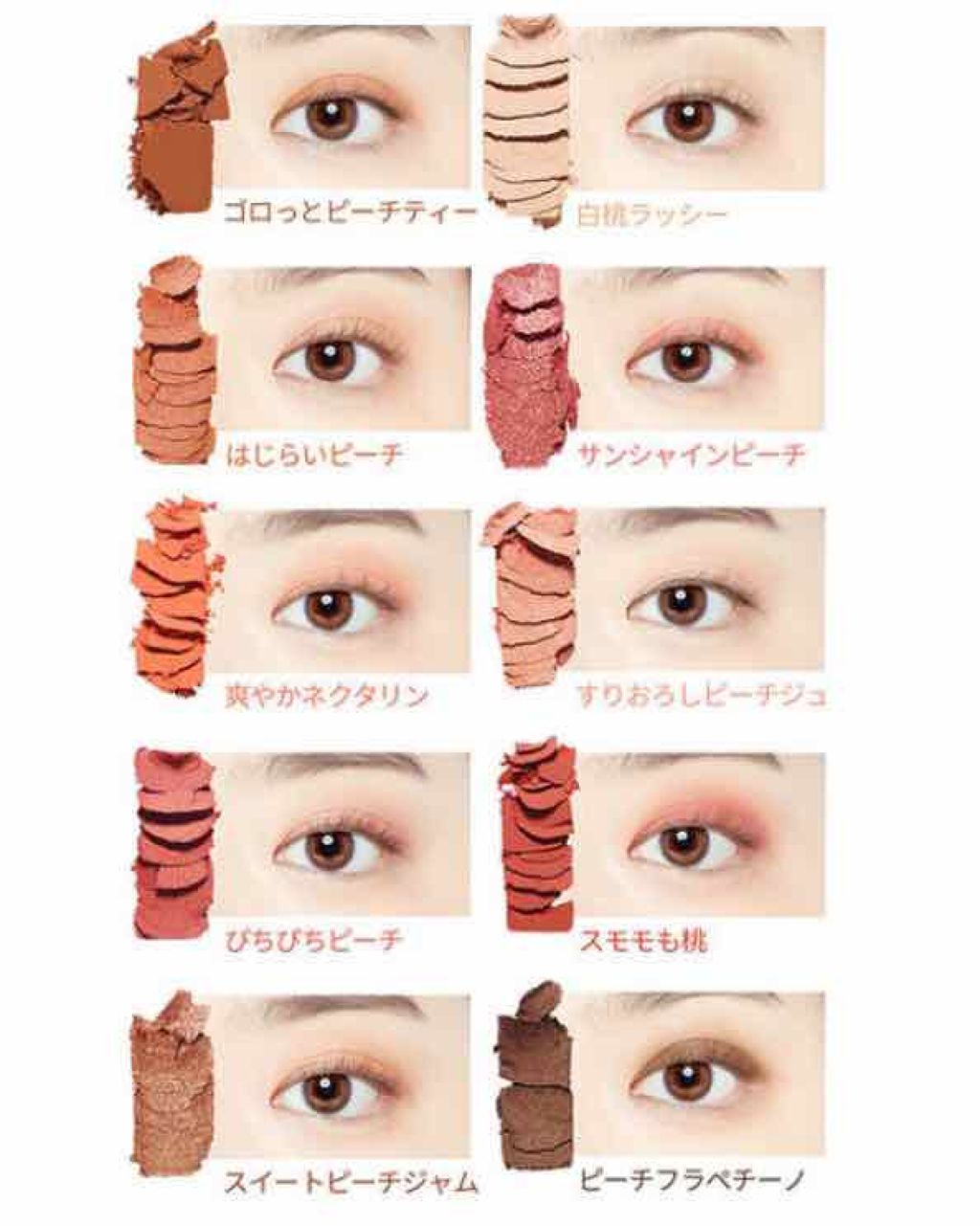 - 肌なじみの良い、鮮やかな発色で目元を華やかに彩る捨て色なしの10色アイシャドウパレット 異なる3種のテクスチャーを自由に組み合わせて、グラデーションも思いのままに。 NEW 2023.4 ・肌トーンにあう配色を詰め込んだトレンドカラー 肌トーンに合わせて、自分に似合うトレンドカラーが楽しめる♡ パーソナルカラー×トレンドカラーの掛け合わせパレットで、デイリーメイクもスペシャルメイクも気分にあわせてなりたい自分に! ・むにゅっとジェル質感ラメで高密着、煌めく目元 パレットの中でもポイントとなる大きめ粒子のラメは、ジェルのような新質感で落ちにくく肌にぴったりと密着します。キラキラとした目元をキープします。 ・使うカラーは大きめに!リアル捨て色なしパレット ベースやラメのよく使うカラーと締め色や濃い色等の減りが少ないカラーを異なるサイズで詰め込んだ、リアル捨て色なしパレット! <使用方法> 付属のデュアルシャドウブラシでベースカラーをまぶた全体に塗り広げます。細いブラシでグラデーションや目尻、アイライン、涙袋などのポイントカラーをのせて仕上げます。