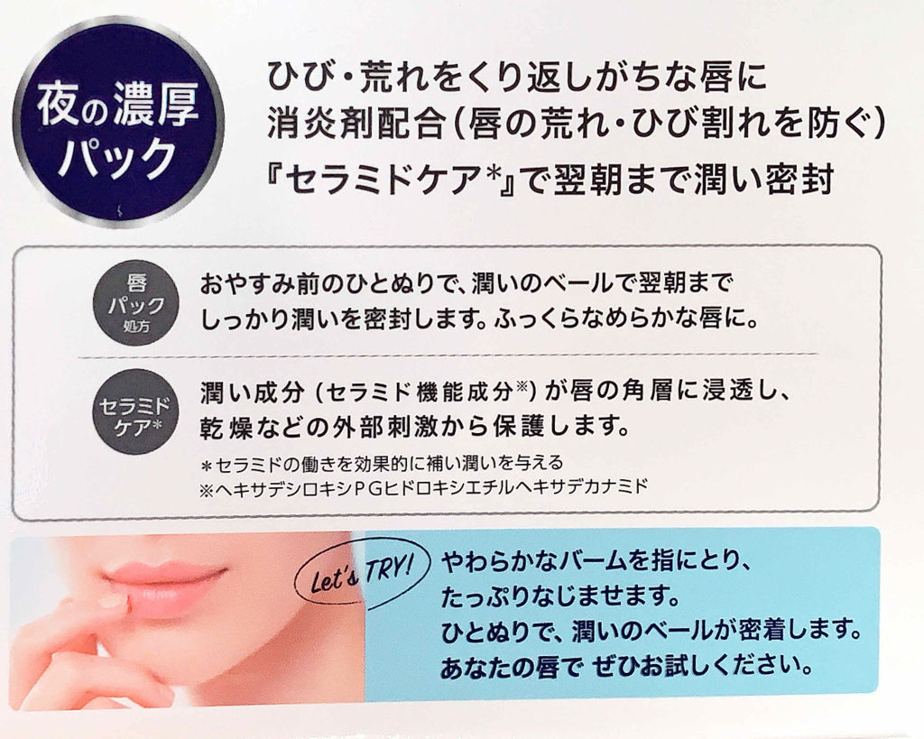 - 【敏感肌用】 ●唇パック処方で、おやすみ前のひとぬりで、潤いベールで翌朝までしっかり潤いを密封します。ふっくらなめらかな唇に。 ●潤し成分(セラミド機能成分*)が唇の各層に浸透し、乾燥などの外部刺激から保護します。 *ヘキサデシロキシPGヒドロキシエチルヘキサデカナミド 〇唇の荒れ・ひび割れを防ぎます。消炎剤(有効成分)配合 (医薬部外品) 商品に関するお問い合わせ 受付時間9:00~17:00(土曜・日曜・祝日除く) *製品の誤飲・誤食など緊急の場合は、受付時間外でもお電話ください キュレル:0120-165-698