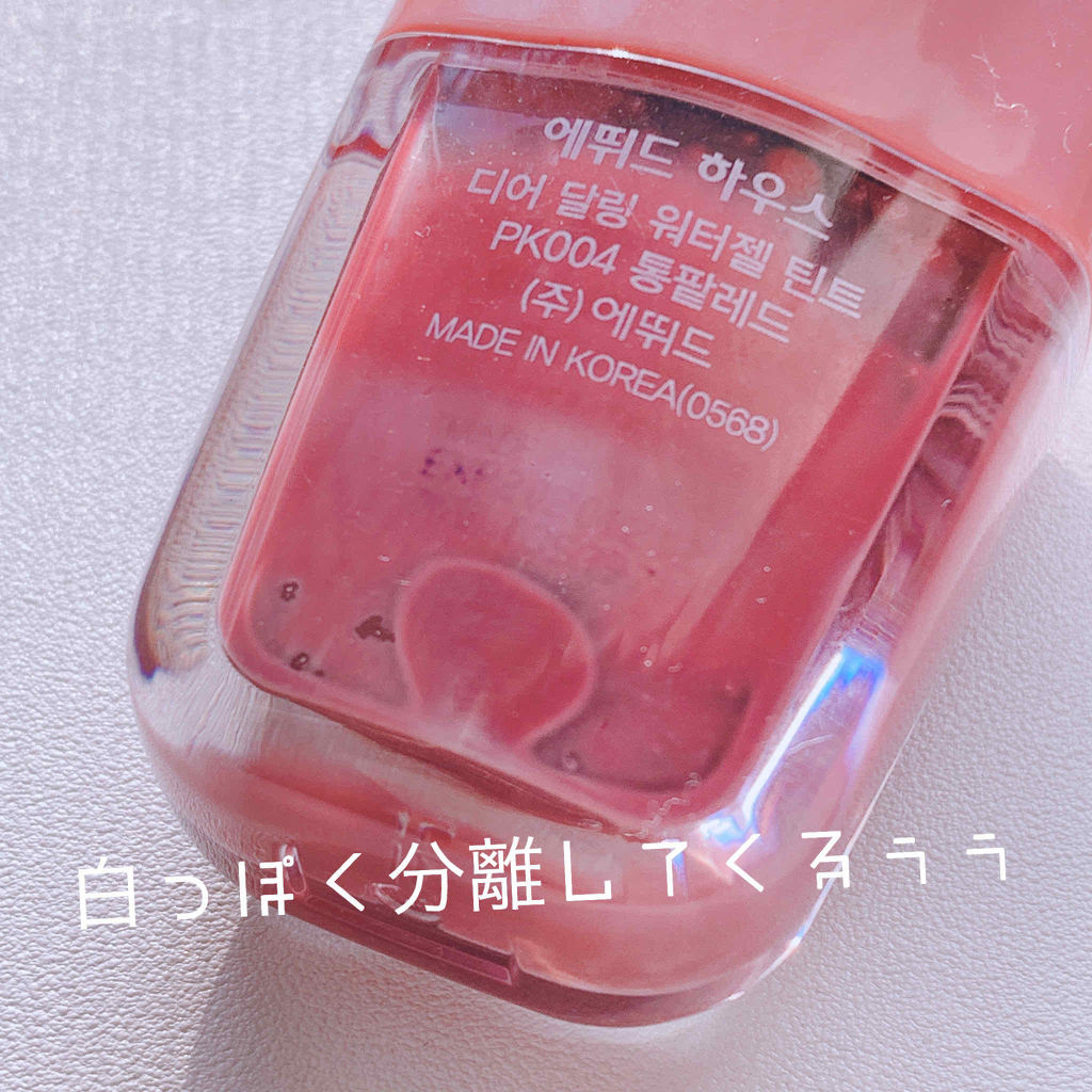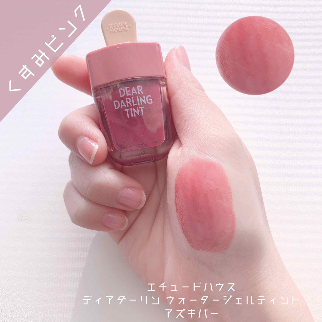 エチュードディアダーリンウォータージェルティントカラーPK004アズキバーアイスバーをモチーフとしたパッケージが可愛くて購入♪フルーツ系の甘い香りがするの🥰色味はピンクパープルのような落ち着いたピンクで、付けた時に色味のギャップがない仕上がり...