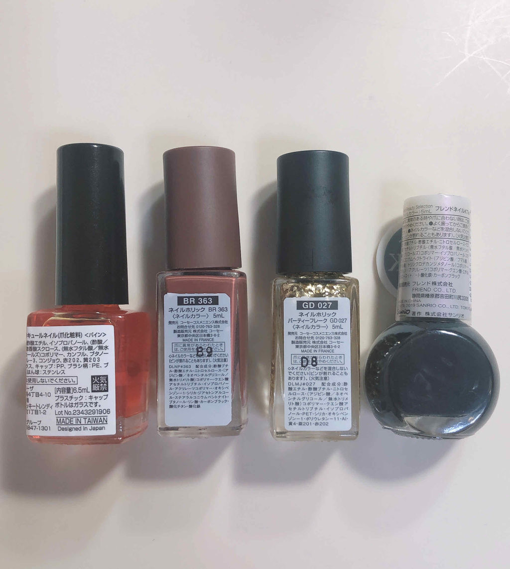 今回はこちらの3色のネイルホリックを使いました!秋っぽさ満載で可愛いと思いますグレーのBR315とチョコレートカラーのBR363とその上から赤いラメのSP024を重ねてます¥300+tax使いやすいグレーは何にでも合いますしブラウンは本当にチ...
