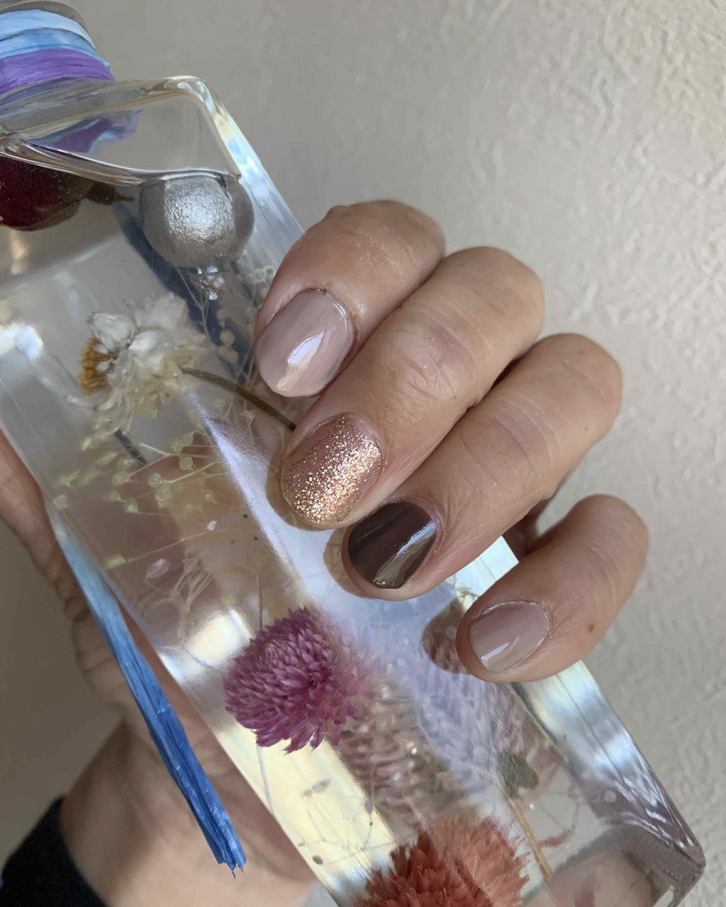 ずっと前から使用しているのですが、一度塗りでも発色がいいのと、何より今まで使ってきた中で乾きが早いところがお気に入りです⭐︎ このオレンジとブラウンが混ざったような深みのある色味がほんっとに可愛い泣 何気血色も良く見える、、 ネイル自体もちも良く、ほんとに乾くのが早いのでドライヤーを使用したり、時間を置いて乾かす必要がないです😌