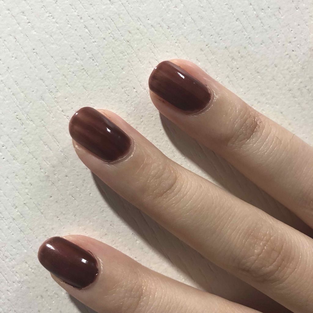 透明感のあるダークレッド。甘辛感がたまりません♡ 塗り心地は以前レビューした通り非の打ち所がないです!!今回は色の好みで★をつけています。 結構大人っぽいダークレッドです。ネイルの長さでも結構印象が変わるかも。